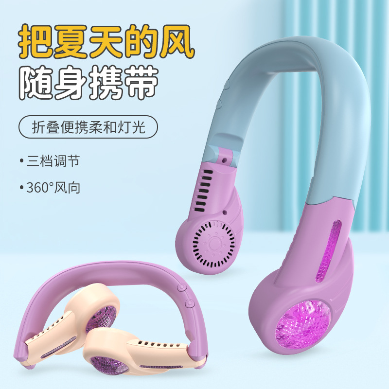 折叠便携式挂脖小风扇USB充电式发光小电风扇三档调速挂脖小风扇