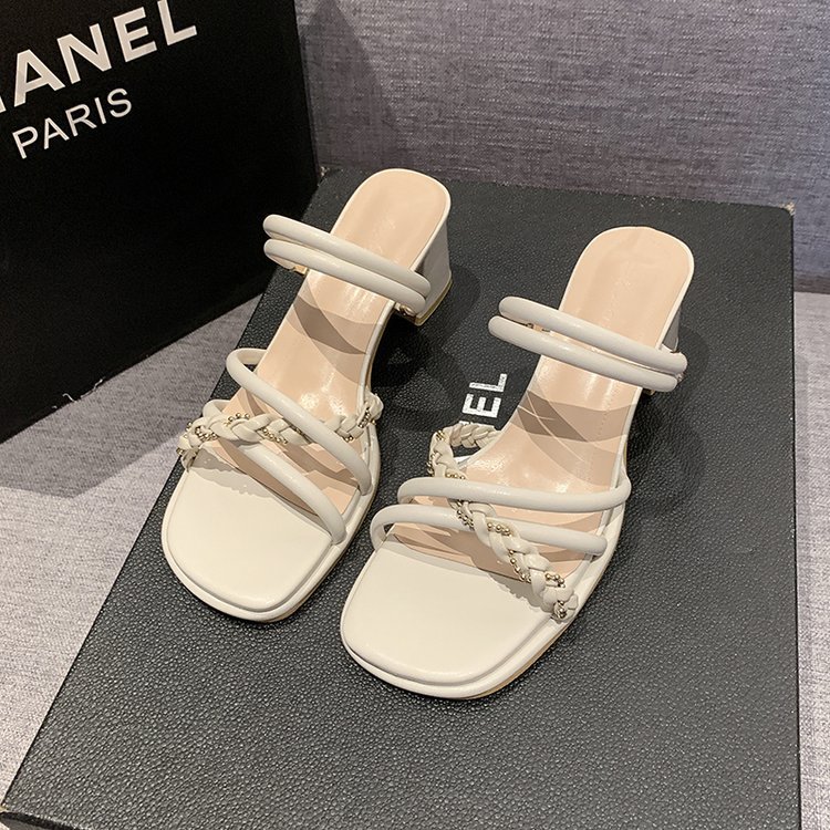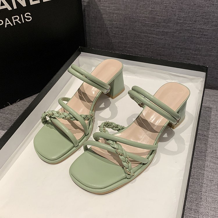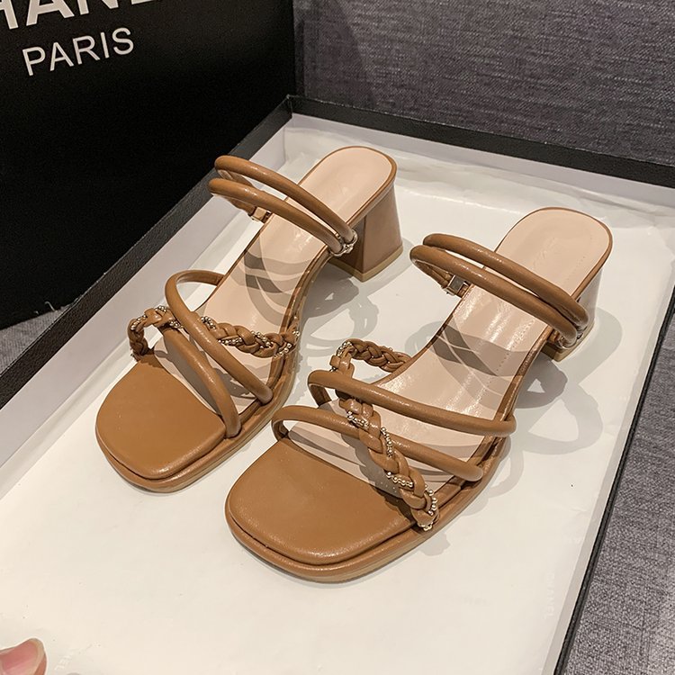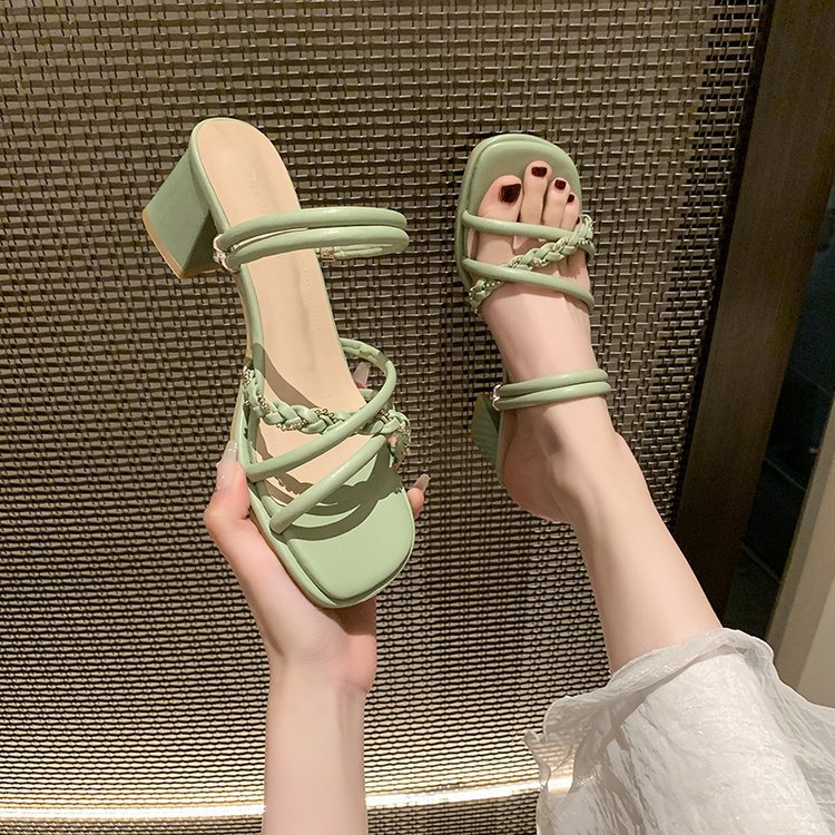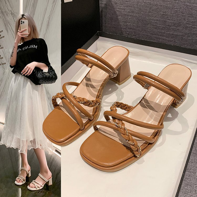 夏季新款粗跟拖鞋女外穿露趾一字高跟鞋时尚两穿凉鞋