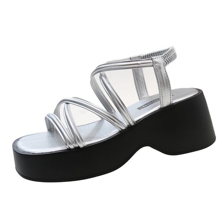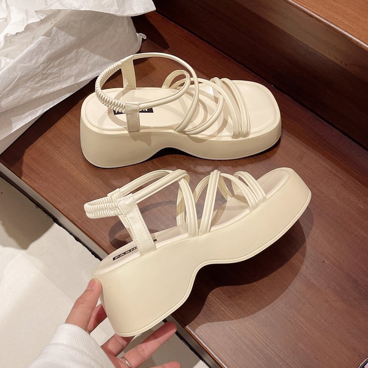 夏季新款松糕厚底凉鞋女松紧带套脚交叉软底中跟休闲凉鞋