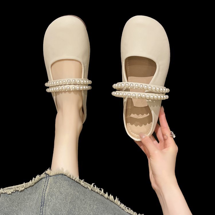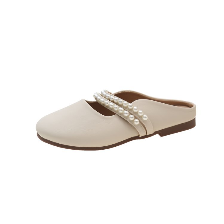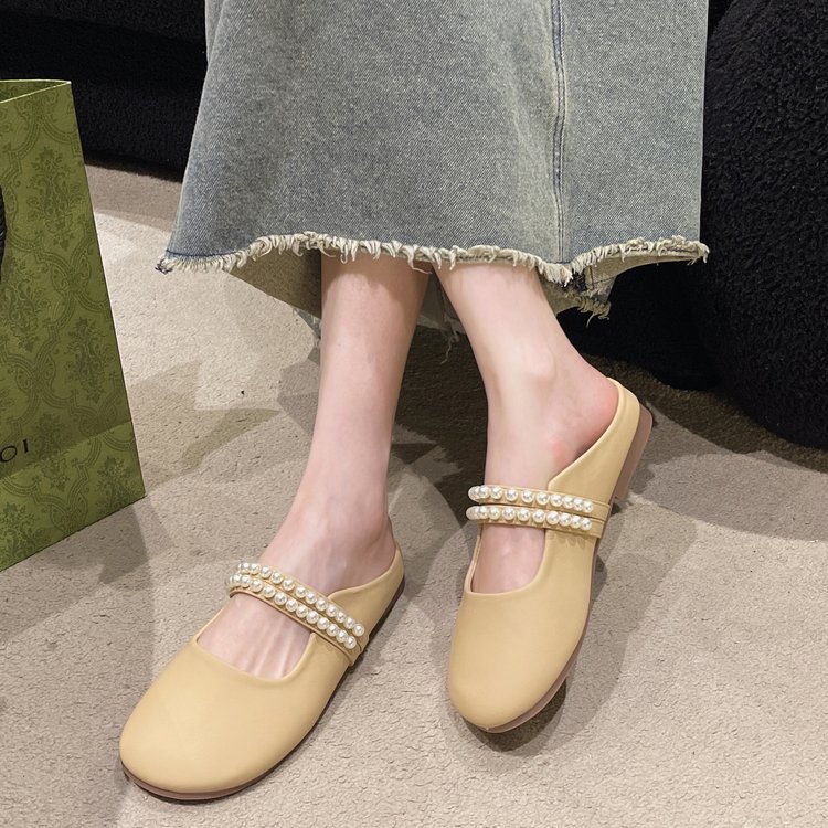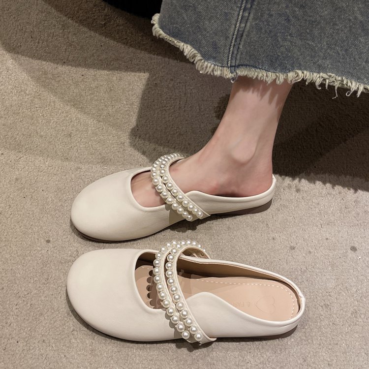 夏季新款包头半拖鞋女外穿珍珠一字带圆头浅口懒人鞋女鞋