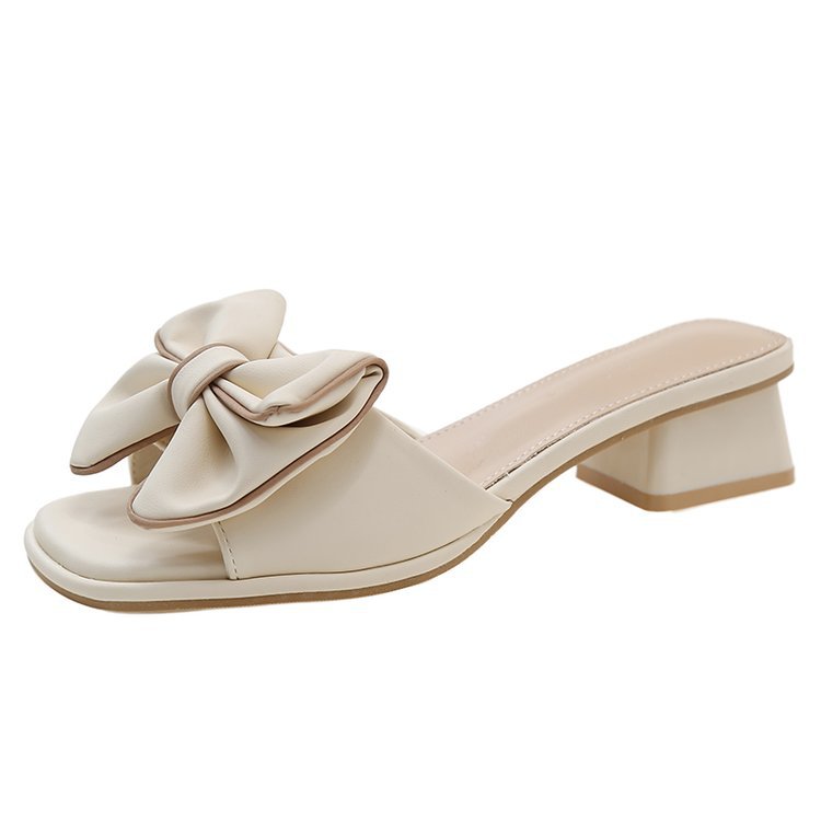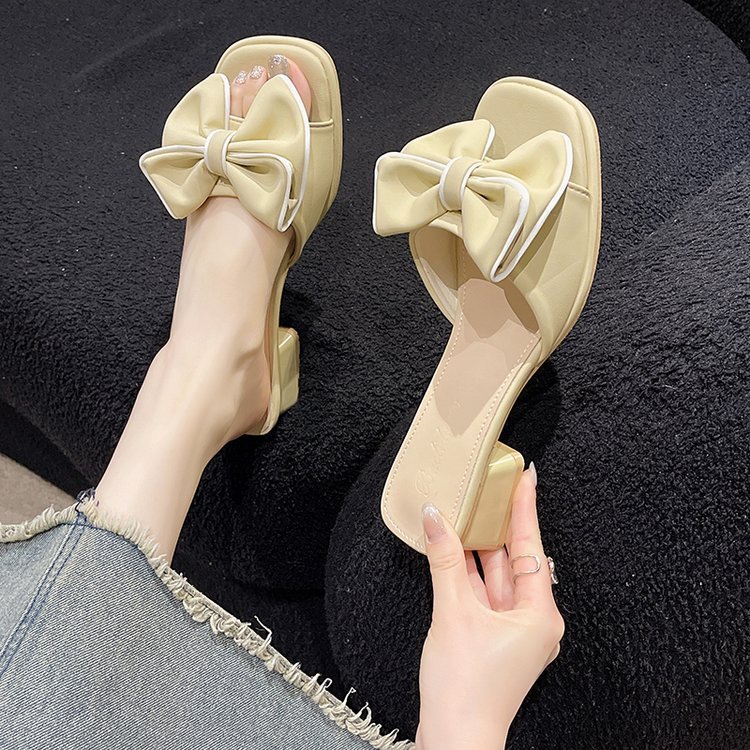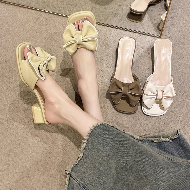 夏季新款蝴蝶结粗跟拖鞋女外穿方头露趾一字时尚大码凉拖