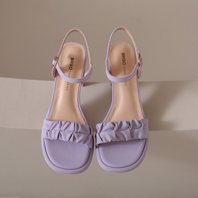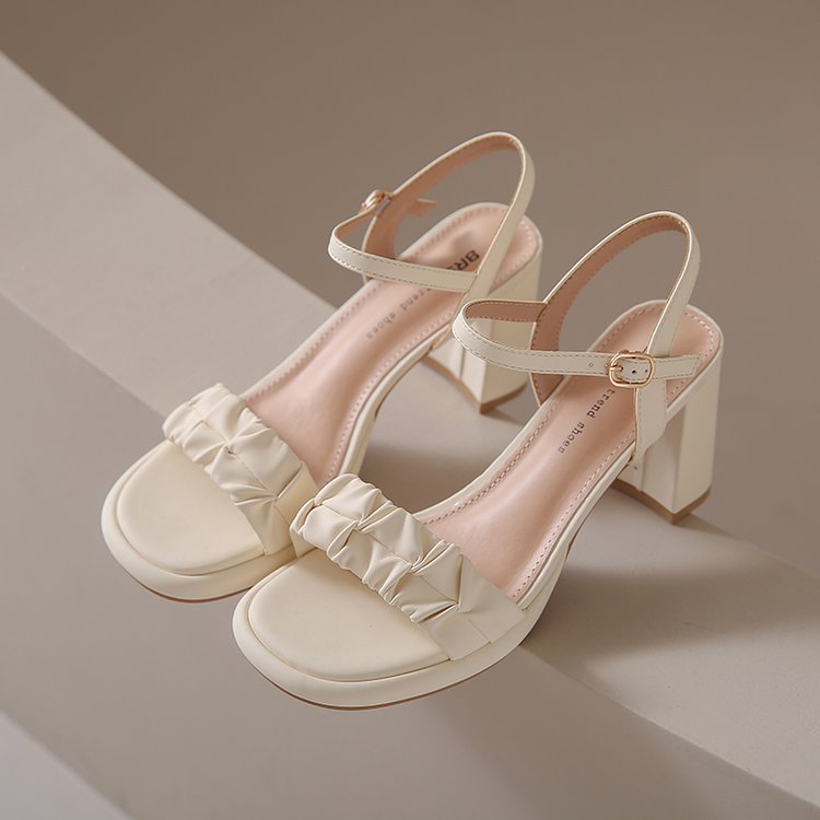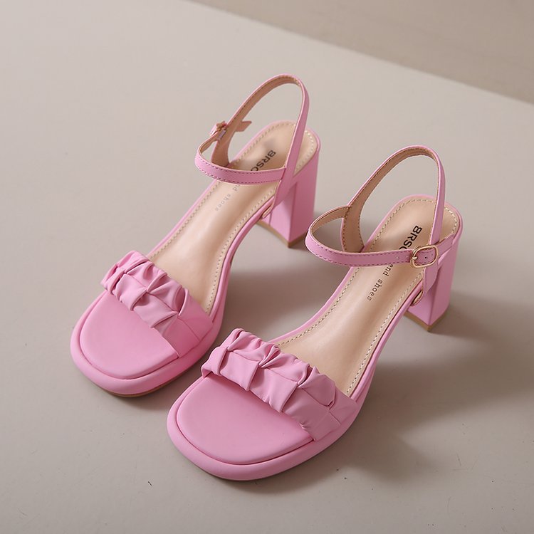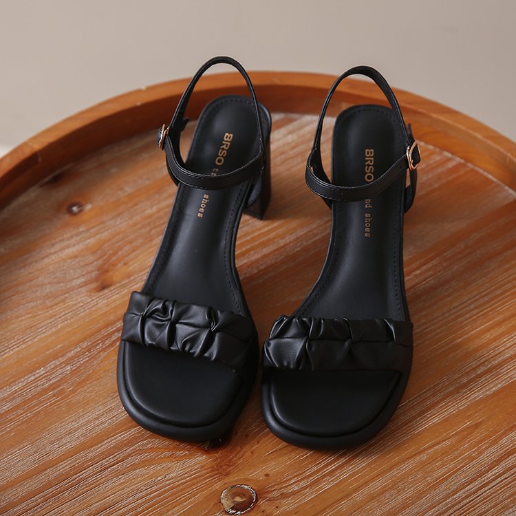 夏季新款韩版粗跟凉鞋女一字搭扣高跟鞋露趾褶皱时装女鞋