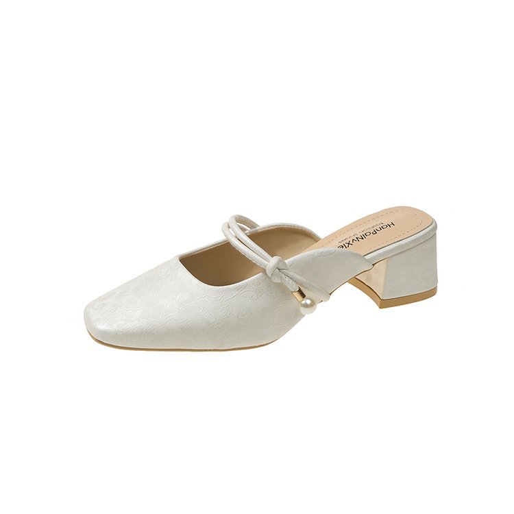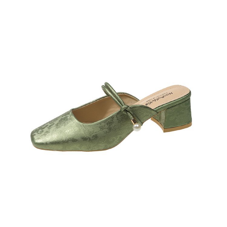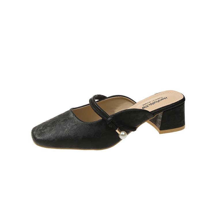 夏季新款包头半拖鞋女外穿粗跟浅口一脚蹬高跟鞋女鞋