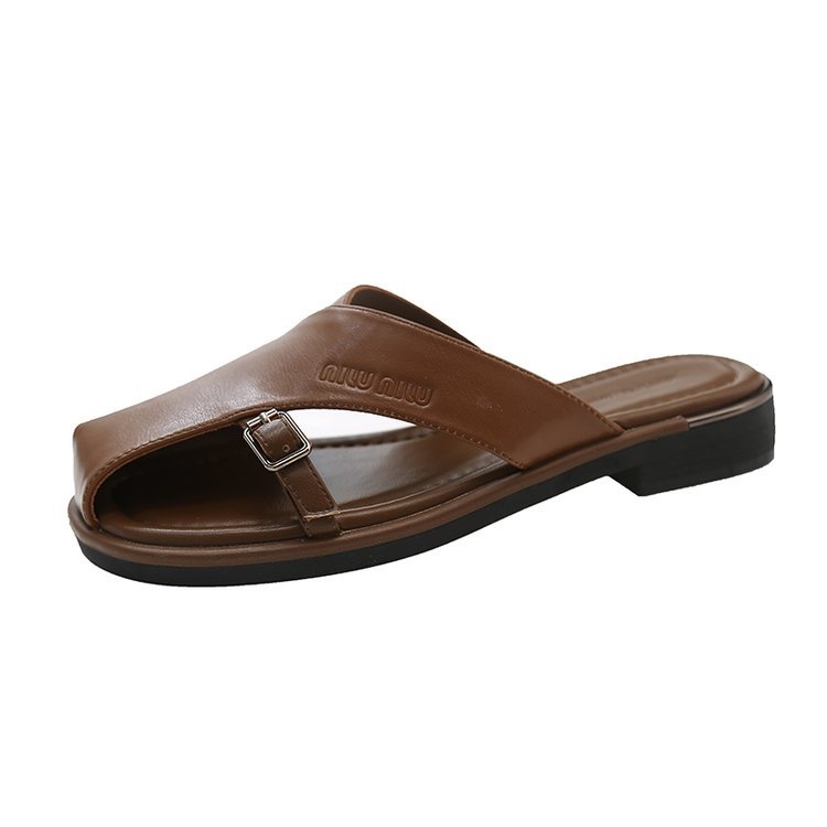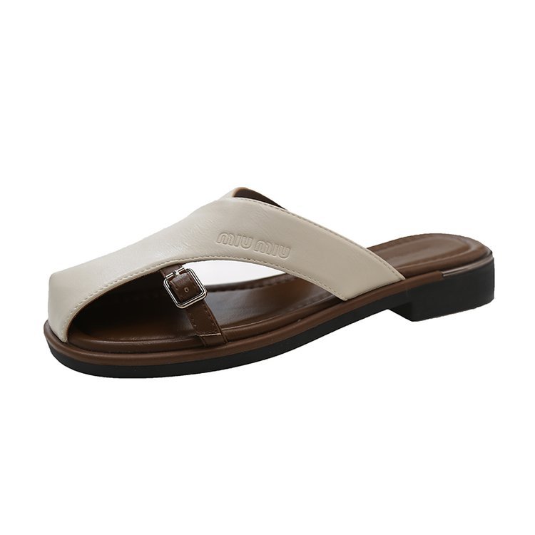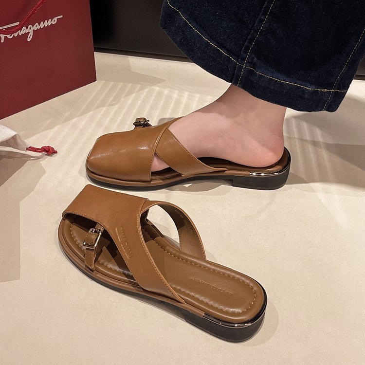 夏季新款包头半拖鞋女外穿平底方头镂空一脚蹬懒人鞋女鞋