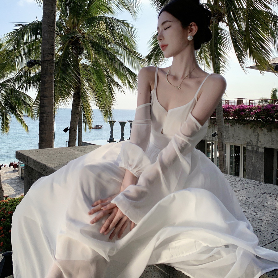 女海边度假沙滩裙泰国三亚露肩长袖吊带连衣裙女纯欲露背长裙