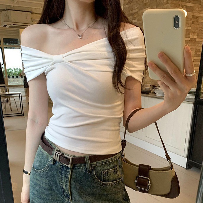 设计感蝴蝶结一字领短袖T恤女夏季新款洋气别致修身显瘦上衣