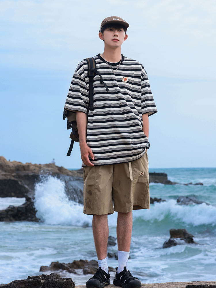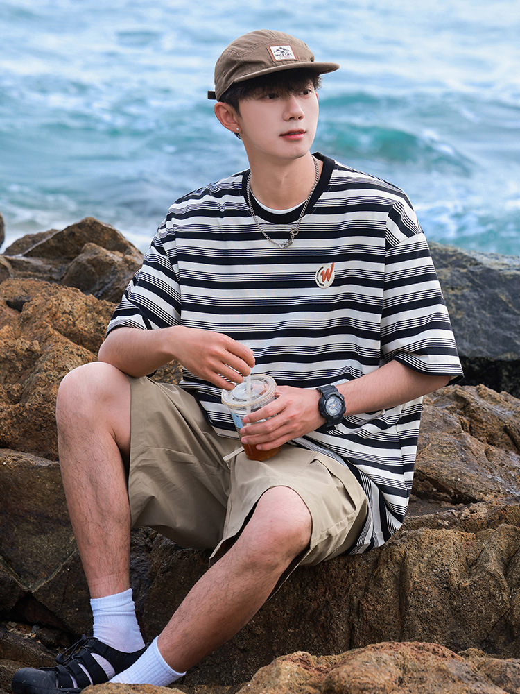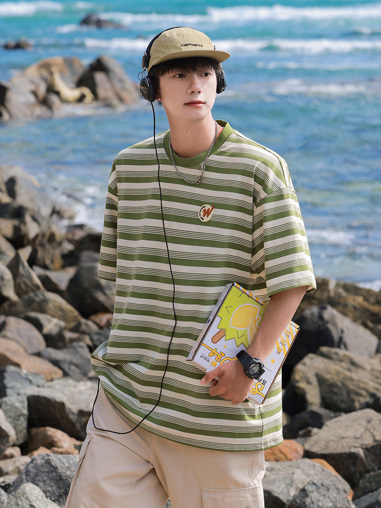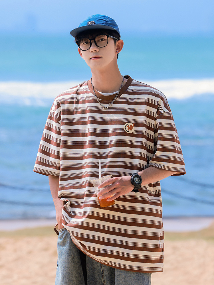 条纹t恤男夏季新品美式潮牌圆领半袖宽松休闲短袖tee