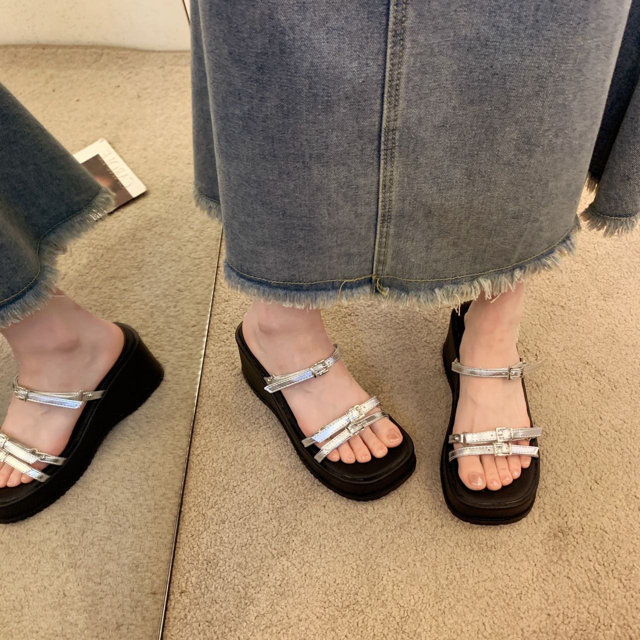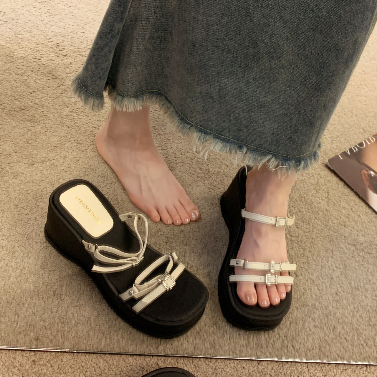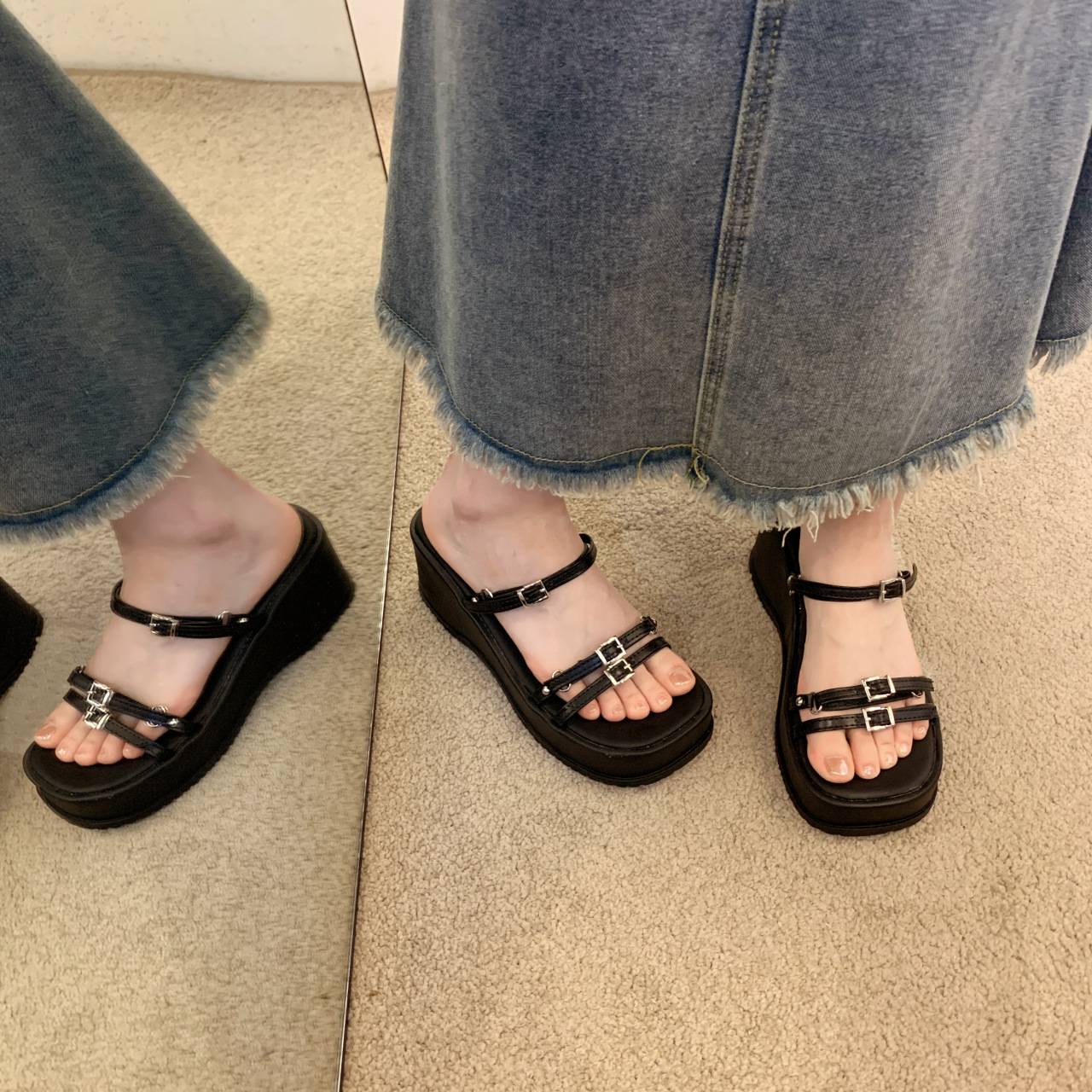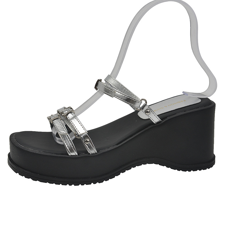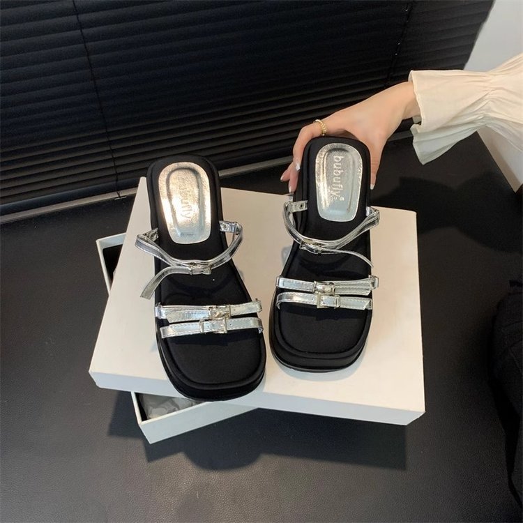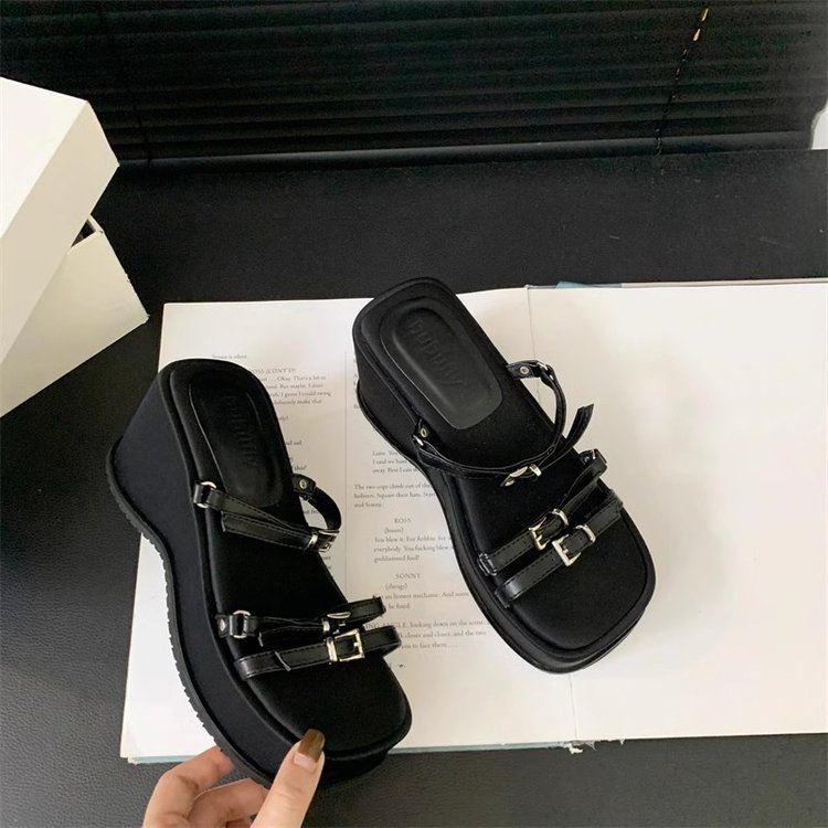 夏季新款韩版松糕厚底拖鞋女外穿皮带扣露趾一字拖坡跟高跟鞋