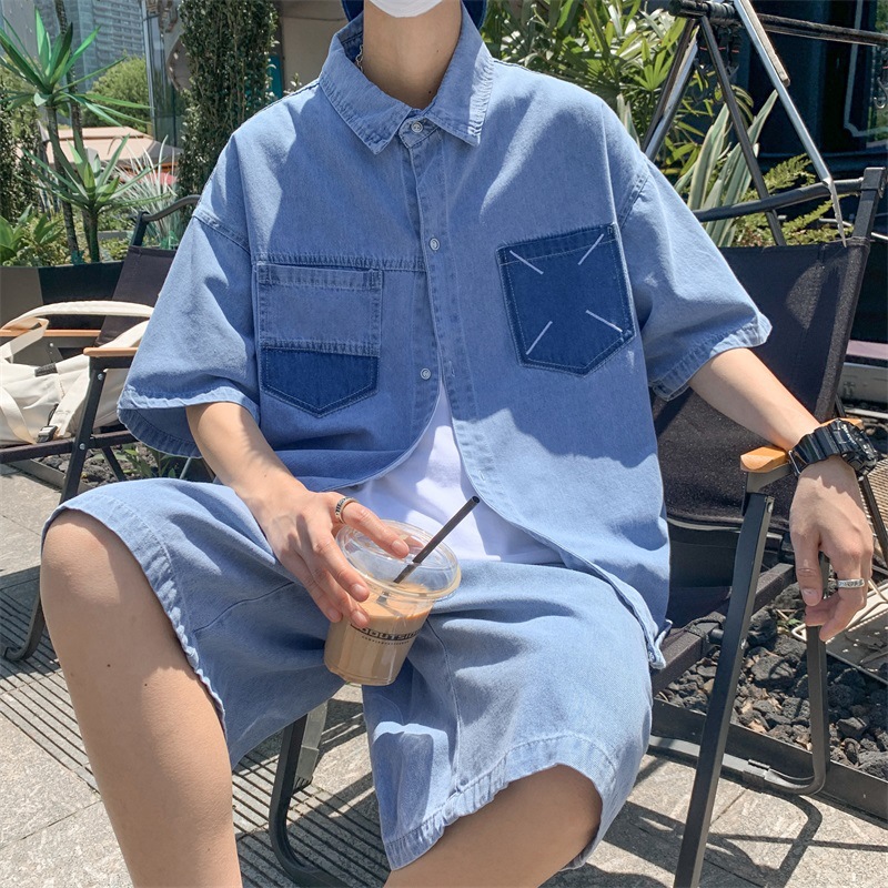 牛仔衬衫男士夏季薄款短袖衬衣男款痞帅五分袖工装休闲外套男生潮