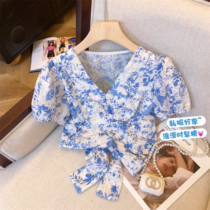 法式碎花V领短袖衬衫女夏收腰显瘦泡泡袖小衫短款后背蝴蝶结上衣