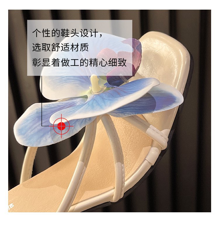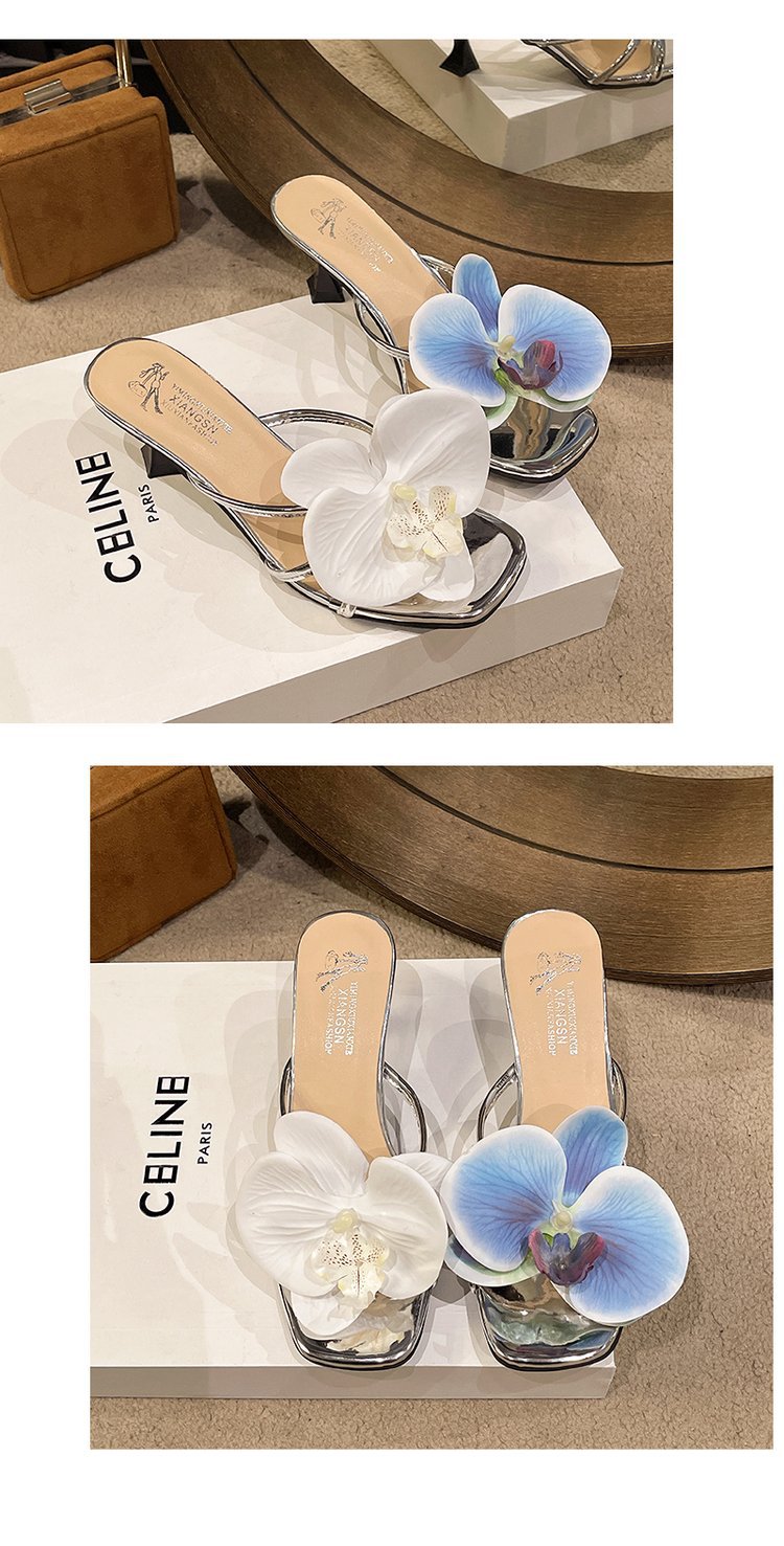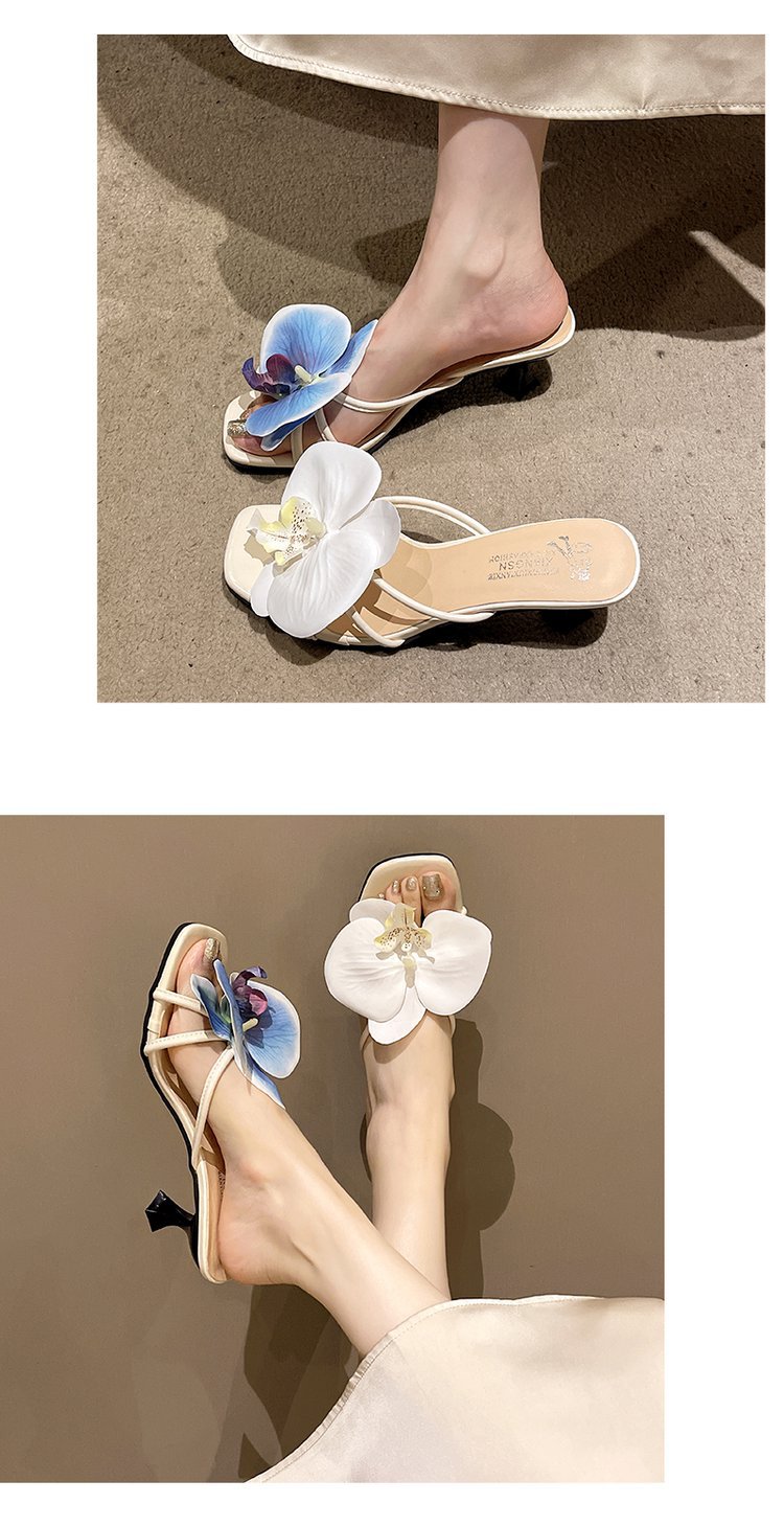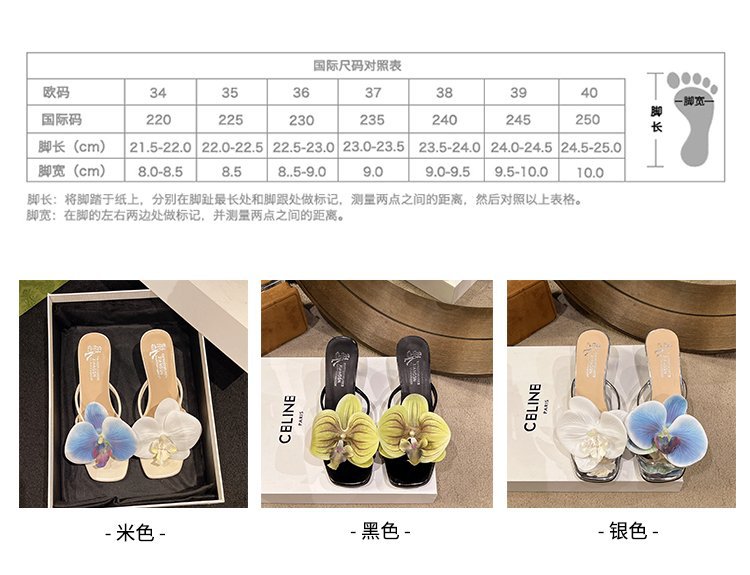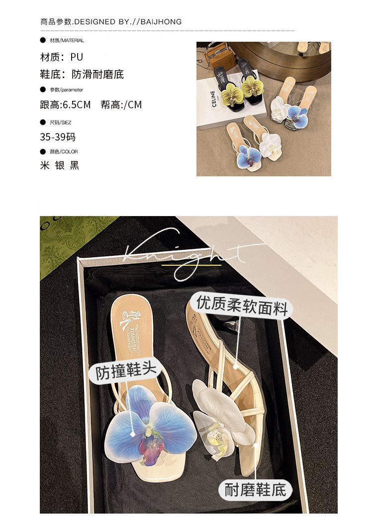 夏季新款立体花朵细跟拖鞋女外穿露趾方头高跟鞋时尚女鞋