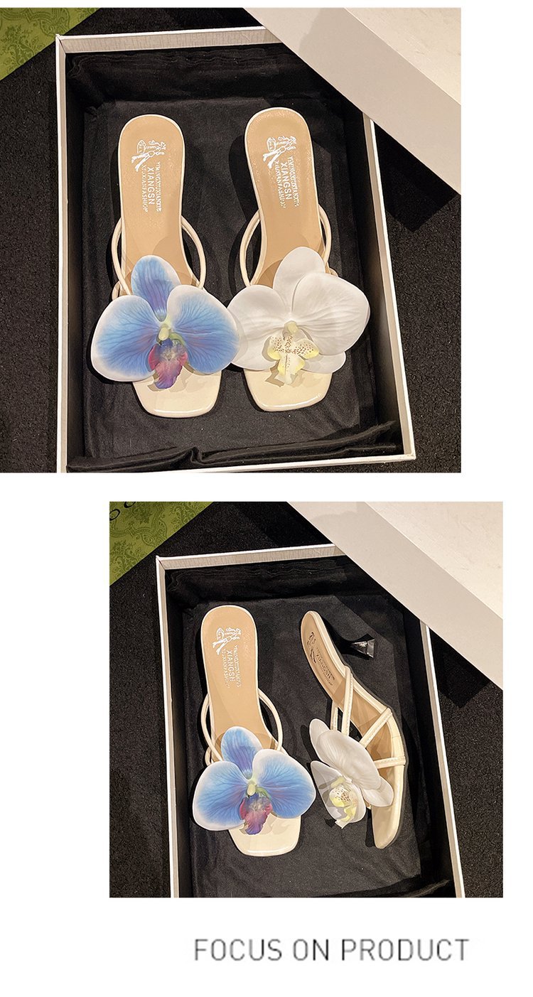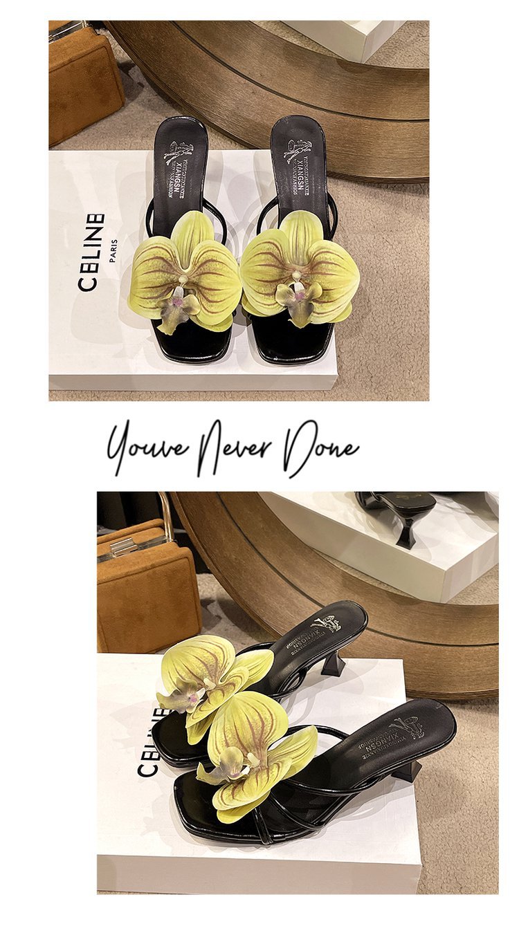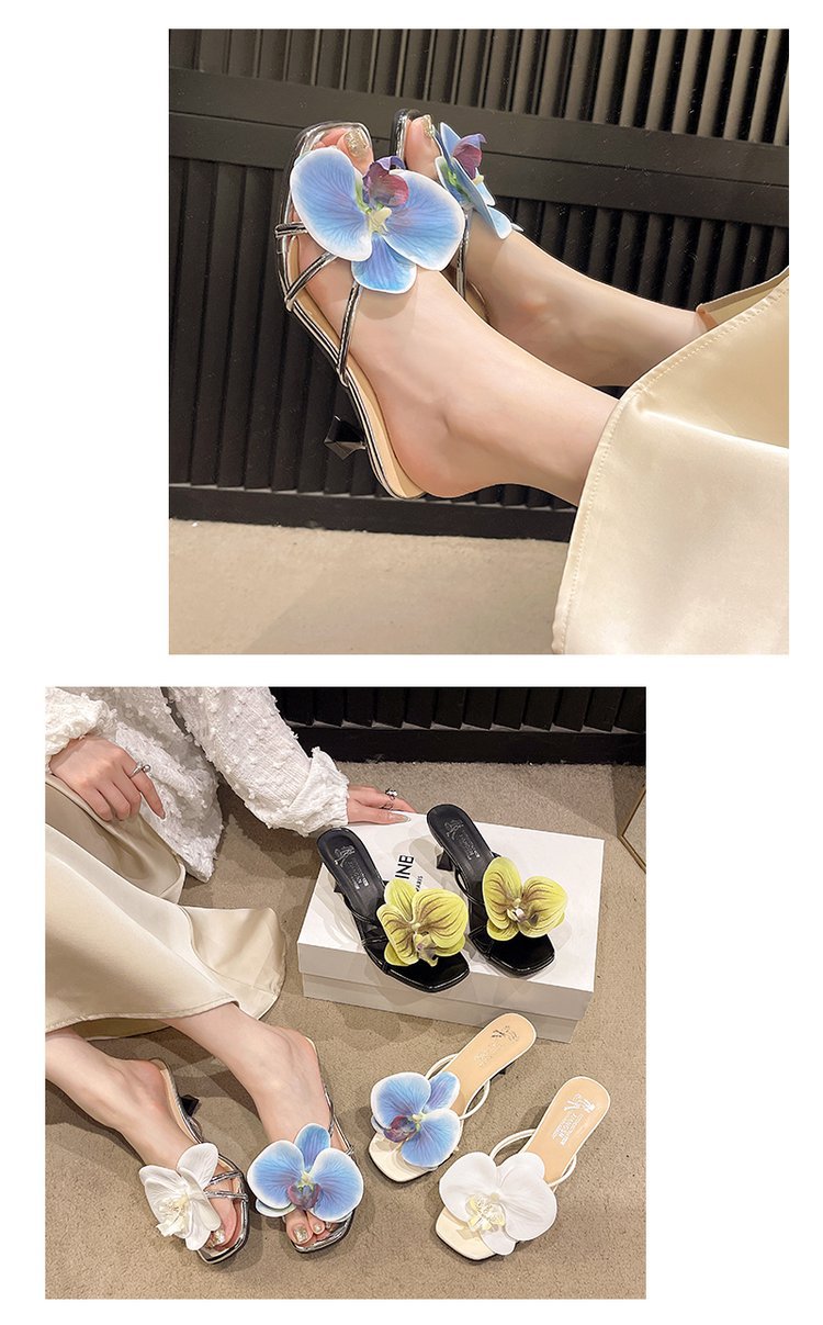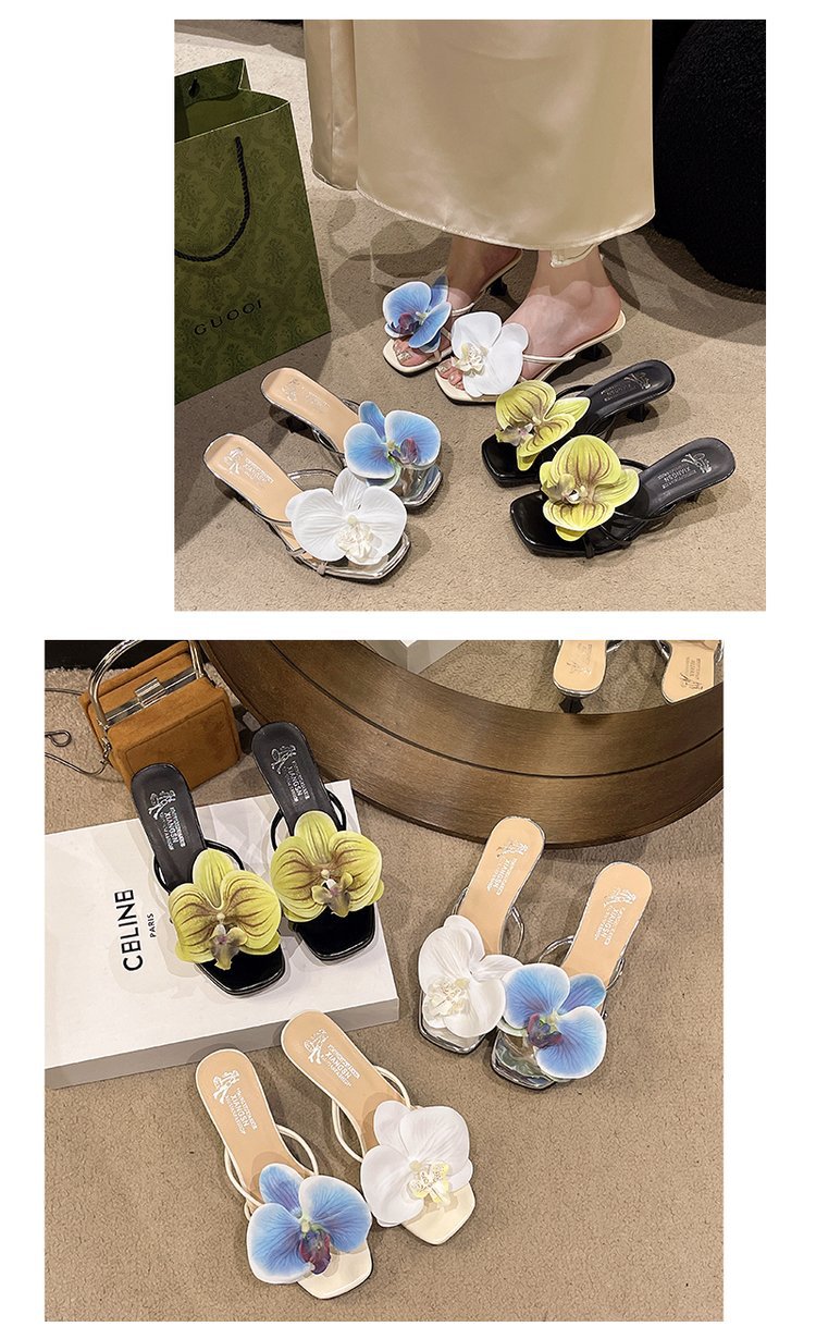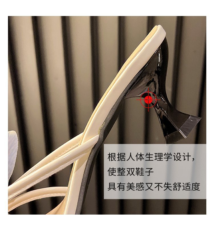 夏季新款立体花朵细跟拖鞋女外穿露趾方头高跟鞋时尚女鞋