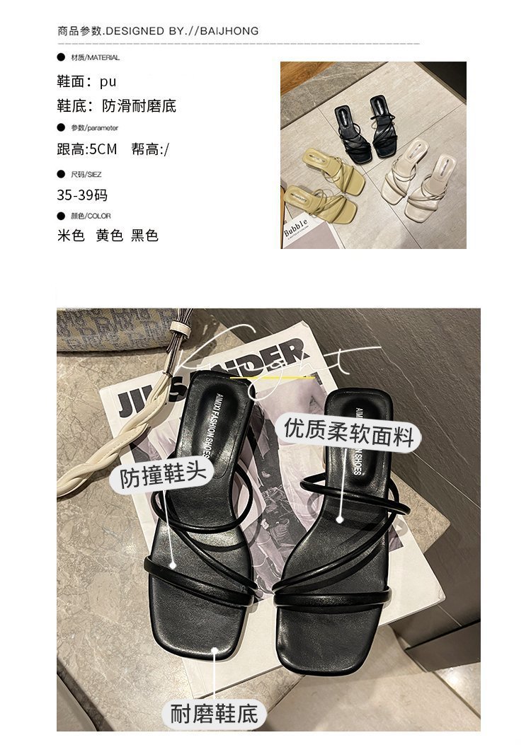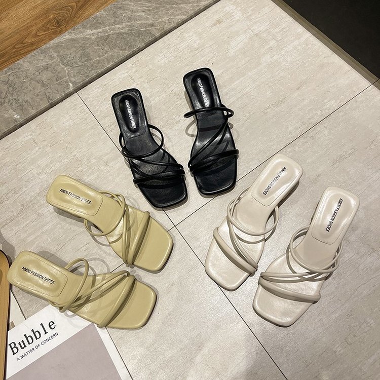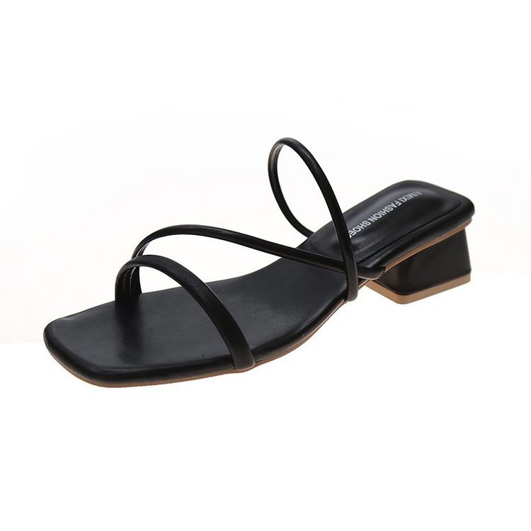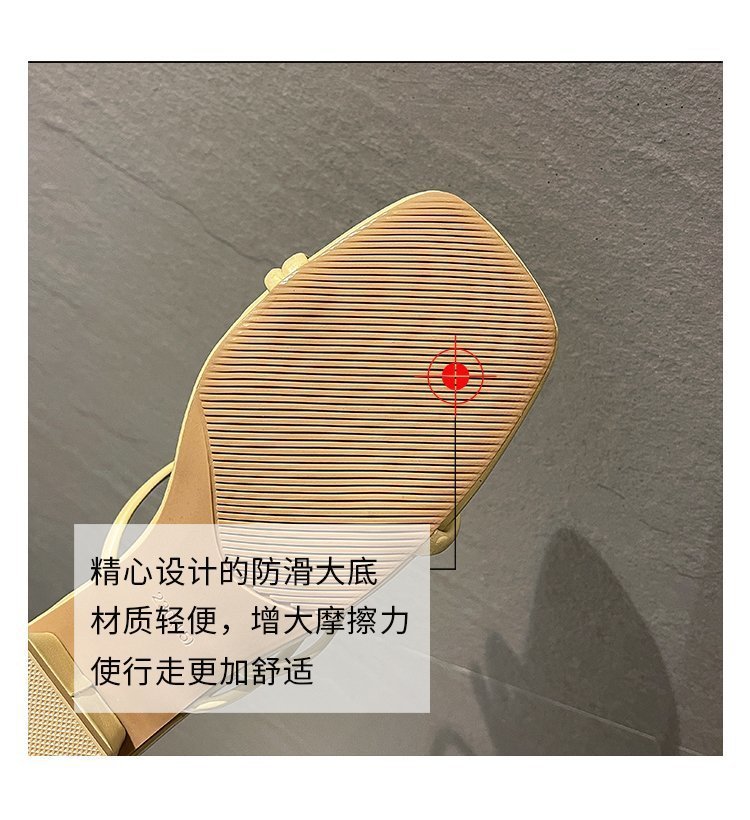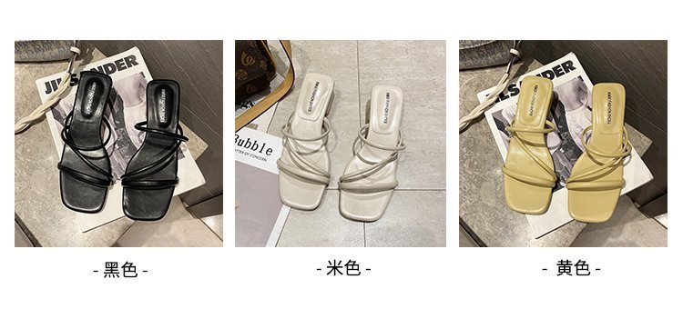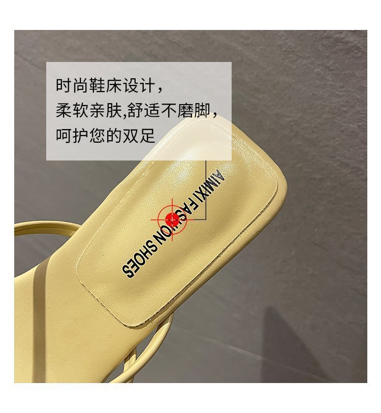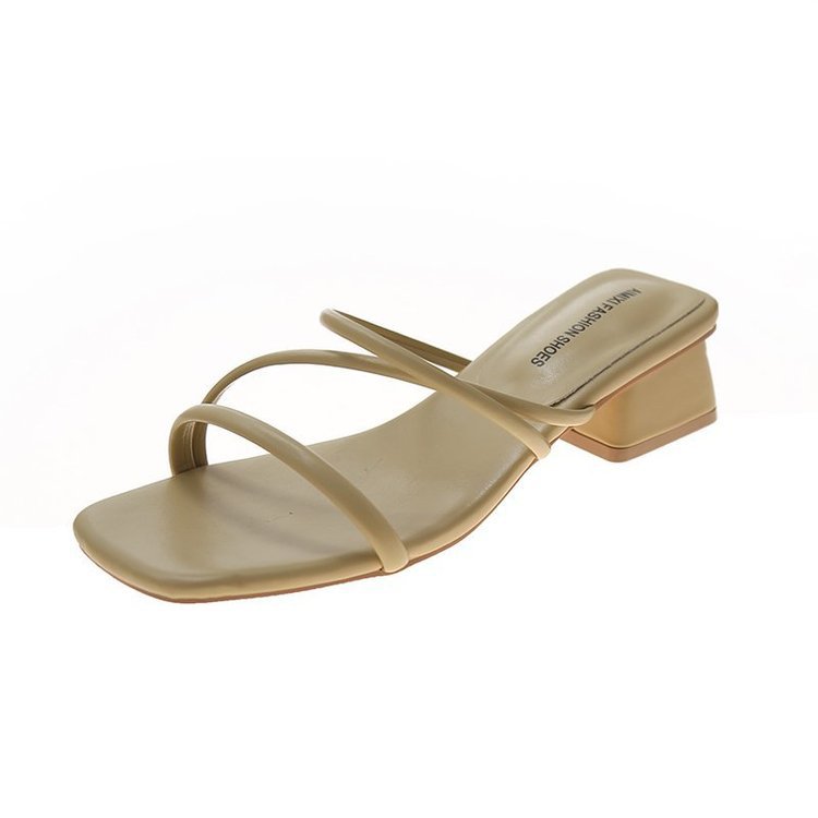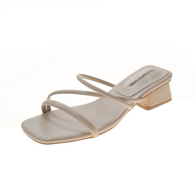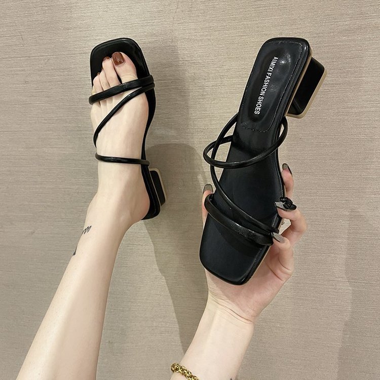 夏季新款仙女风粗跟拖鞋外穿方头露趾一字拖时尚中跟女鞋