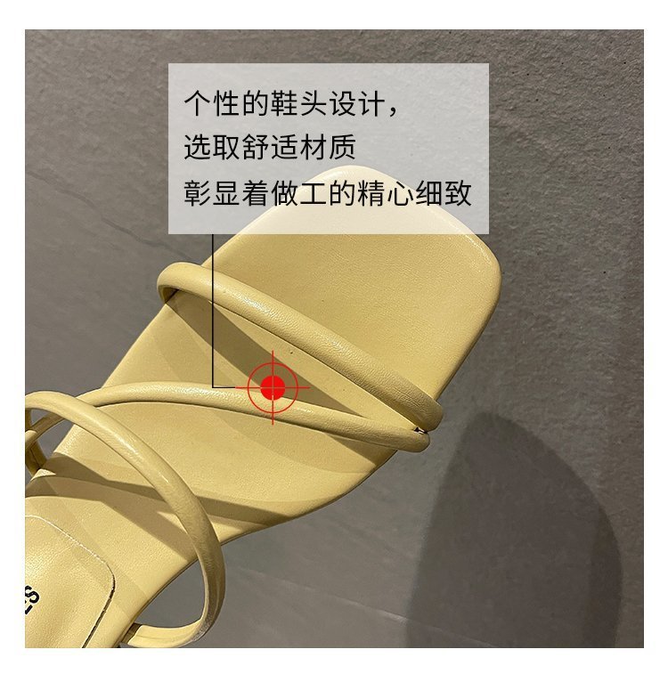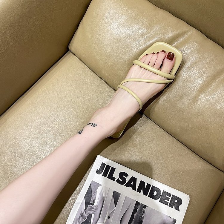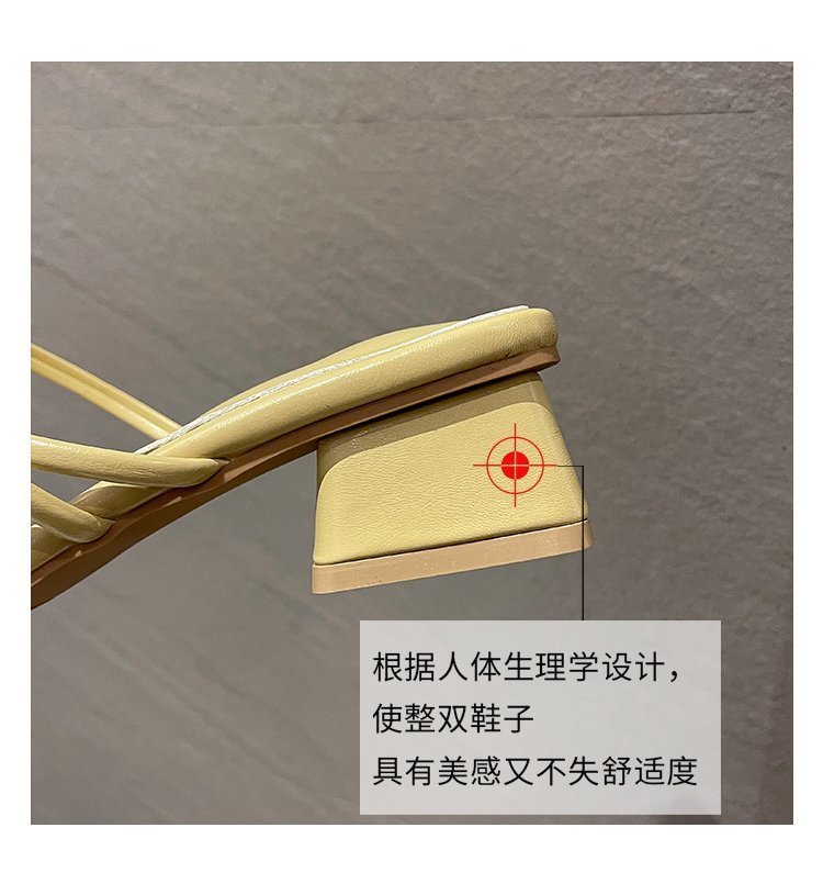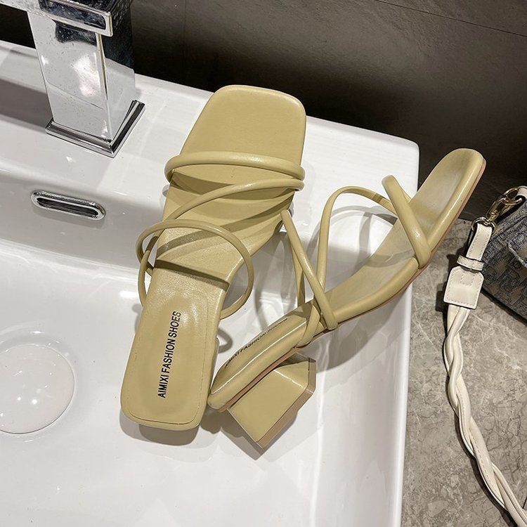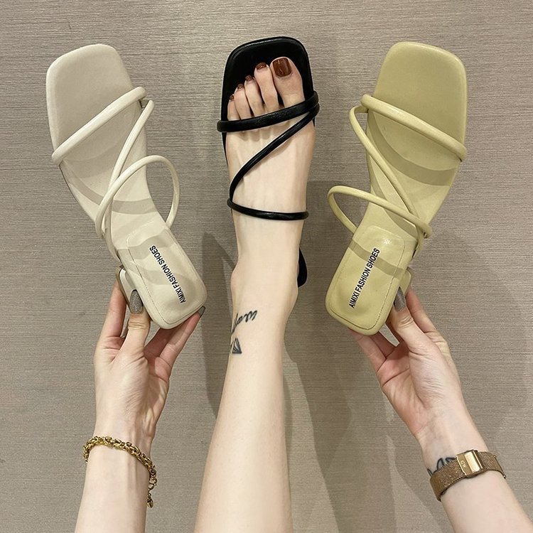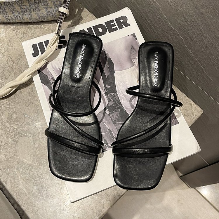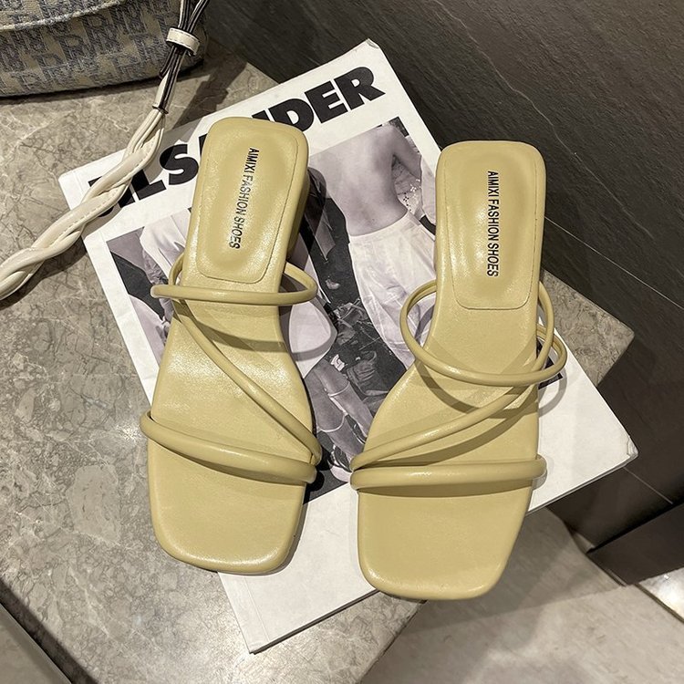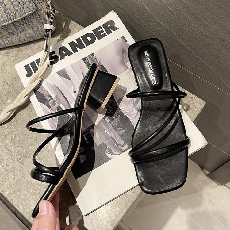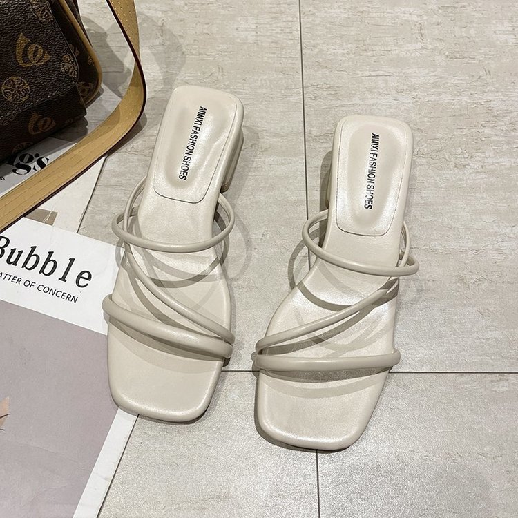 夏季新款仙女风粗跟拖鞋外穿方头露趾一字拖时尚中跟女鞋
