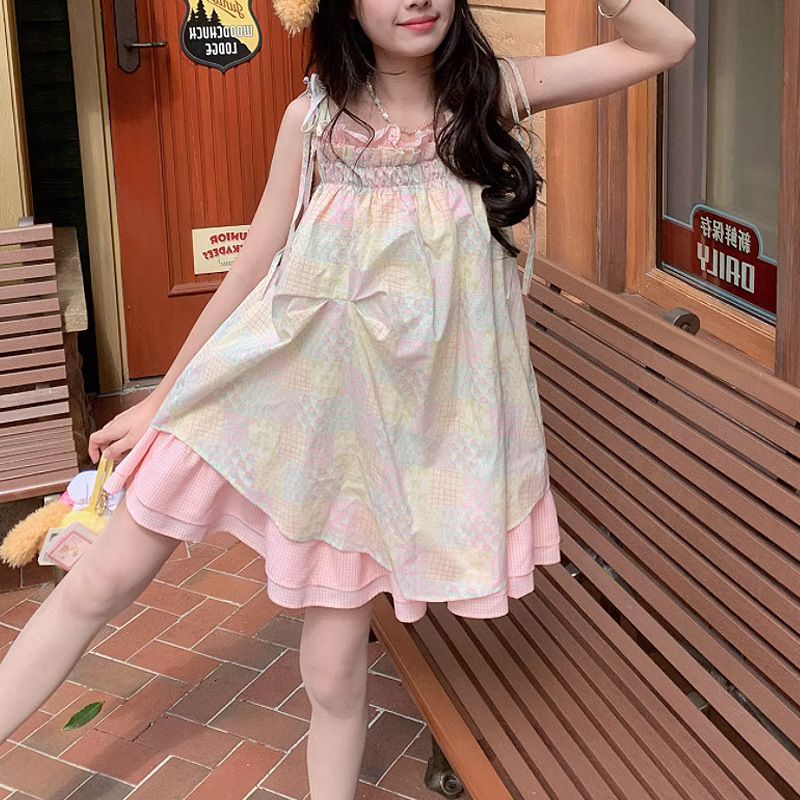 糖果日系度假印花粉紫拼布古着感温柔甜美清新吊带裙女夏新款