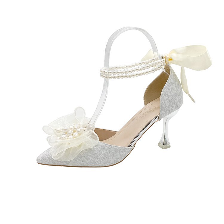 婚鞋女新款蝴蝶结性感网纱仙女单鞋结婚礼服高跟白色婚纱鞋