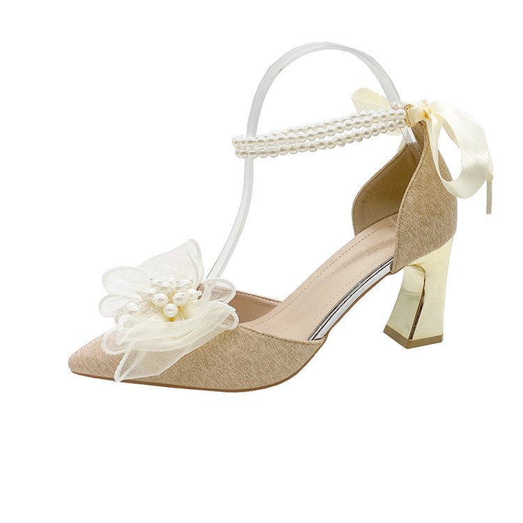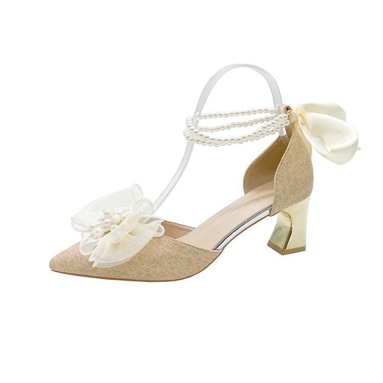 春夏新款仙女尖头单鞋细跟浅口亮片高跟鞋蝴蝶结串珠女鞋