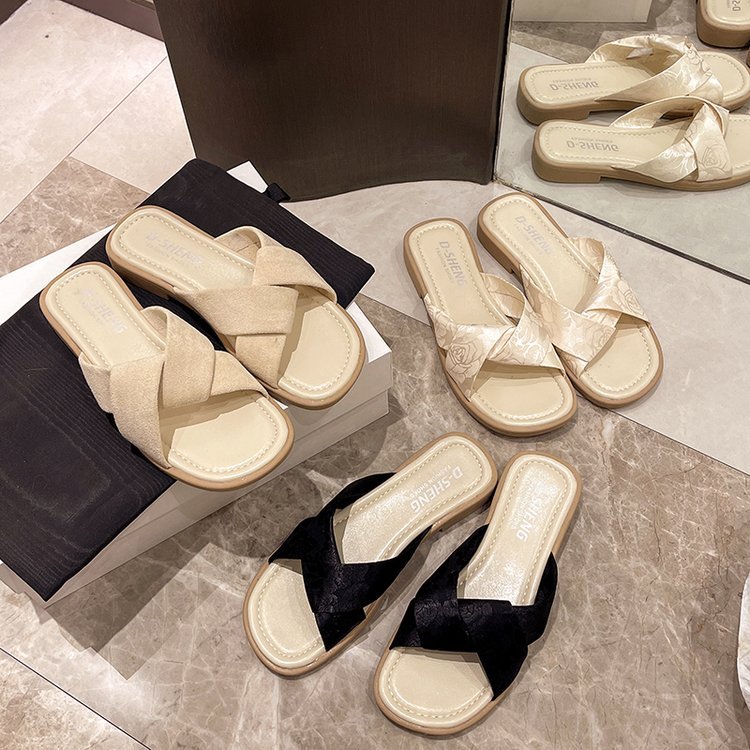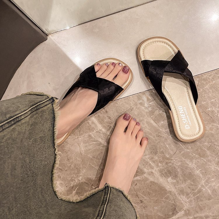 夏季新款国风暗纹印花平底纽带拖鞋女外穿露趾一字拖凉拖