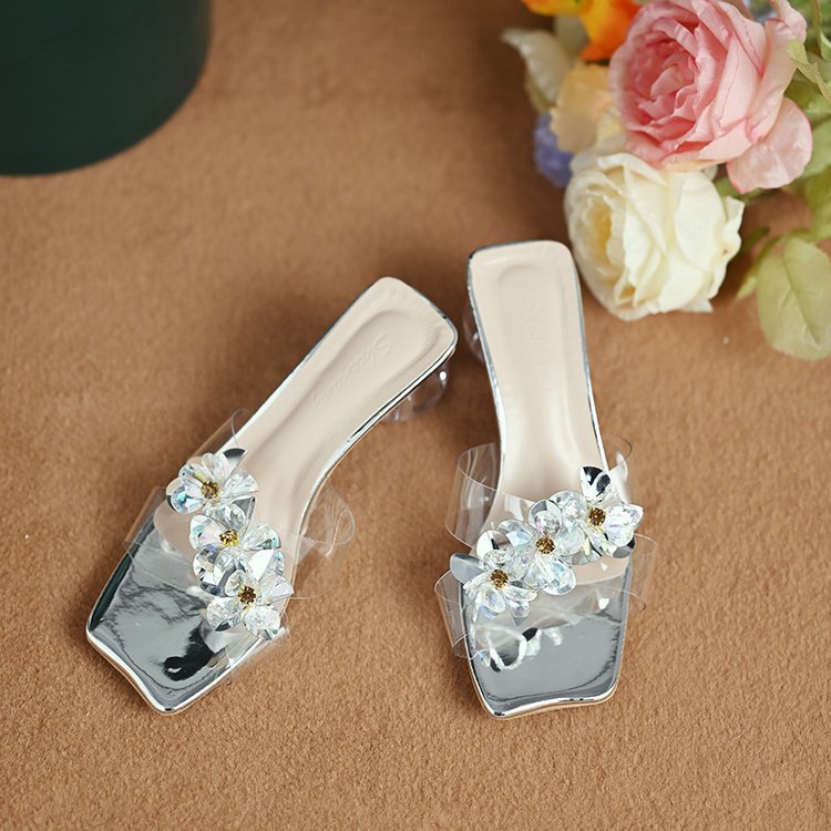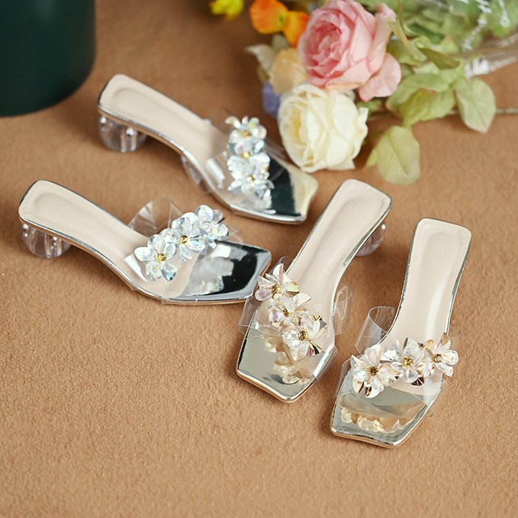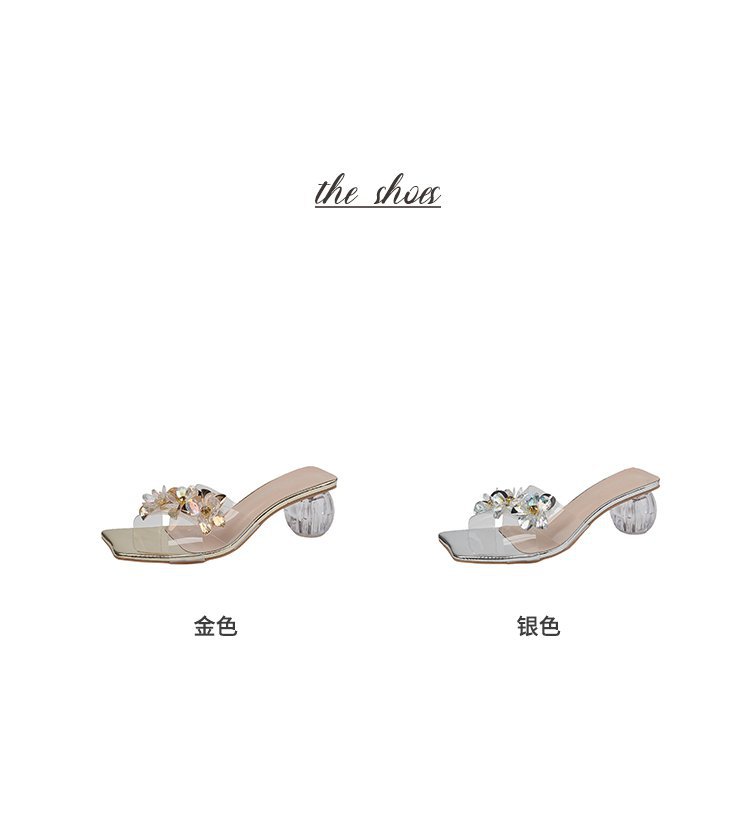夏季新款花朵时装拖鞋女水钻圆形跟一字拖方头时尚高跟鞋