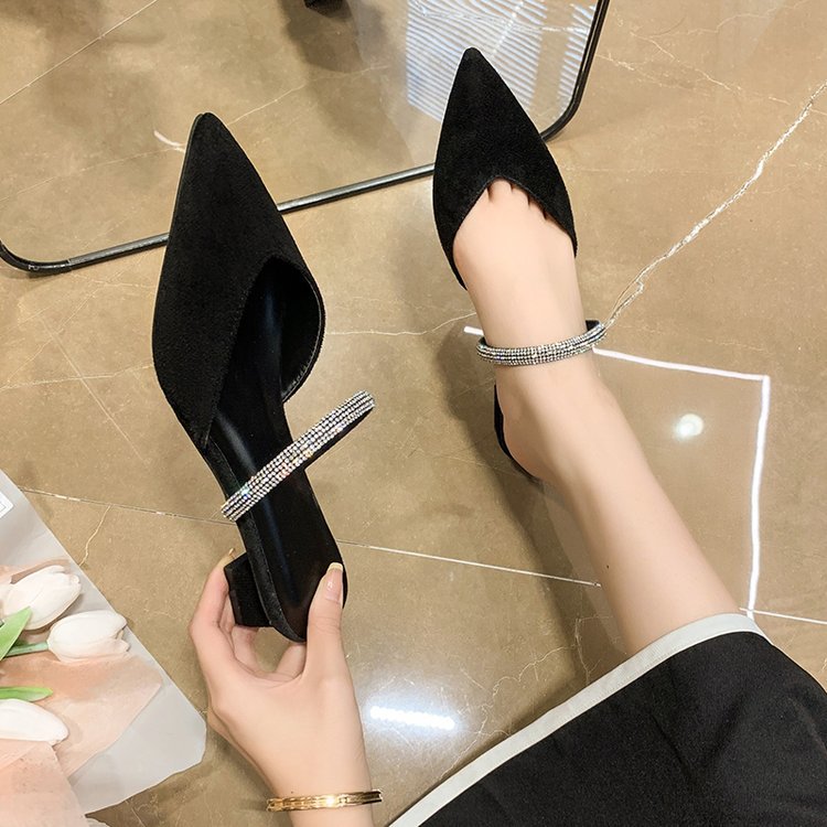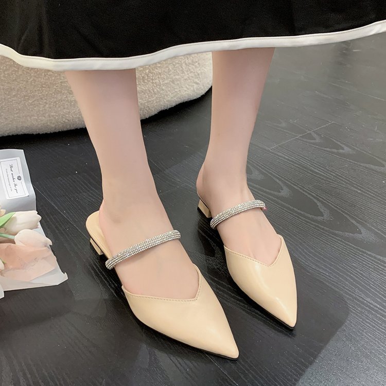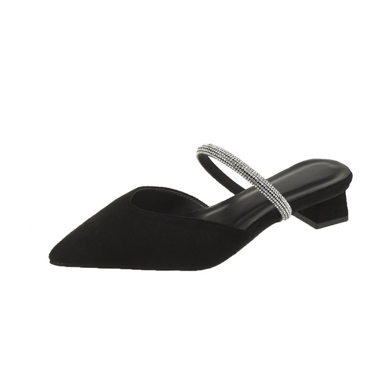 夏季新款尖头半拖鞋水钻一字带粗跟穆勒鞋大码43中跟女鞋