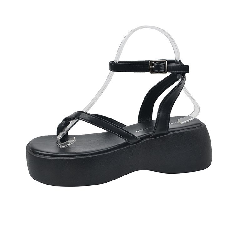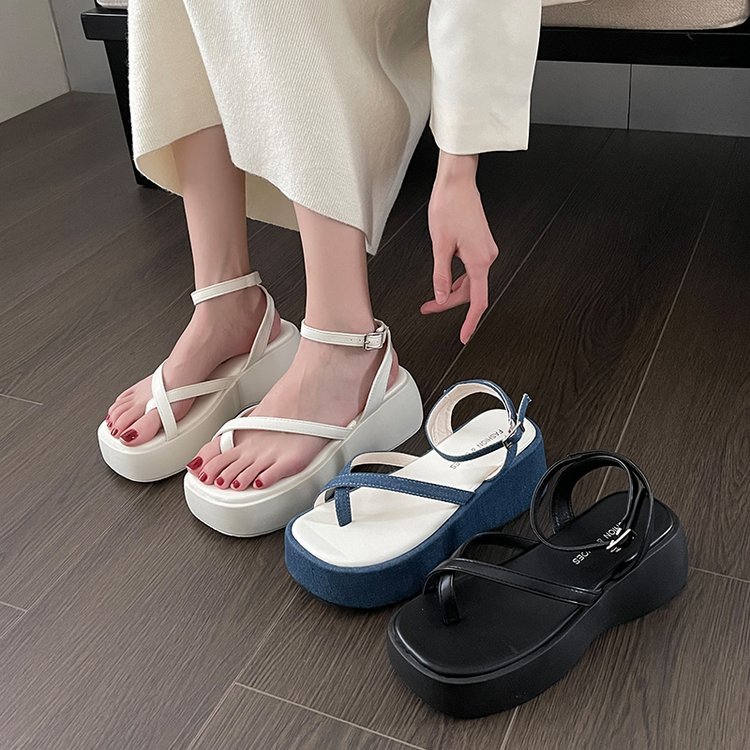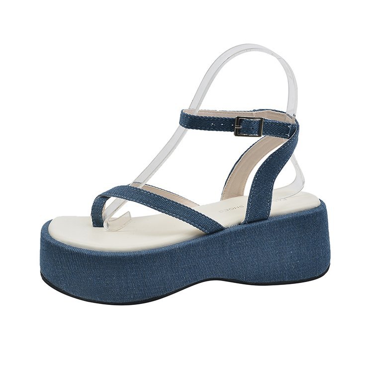 夏季新款韩版牛仔布松糕厚底夹趾凉鞋女脚腕搭扣高跟鞋