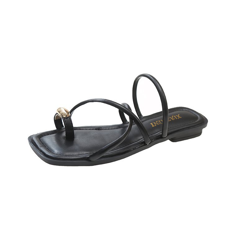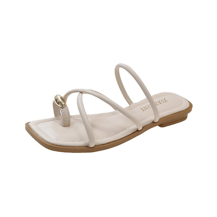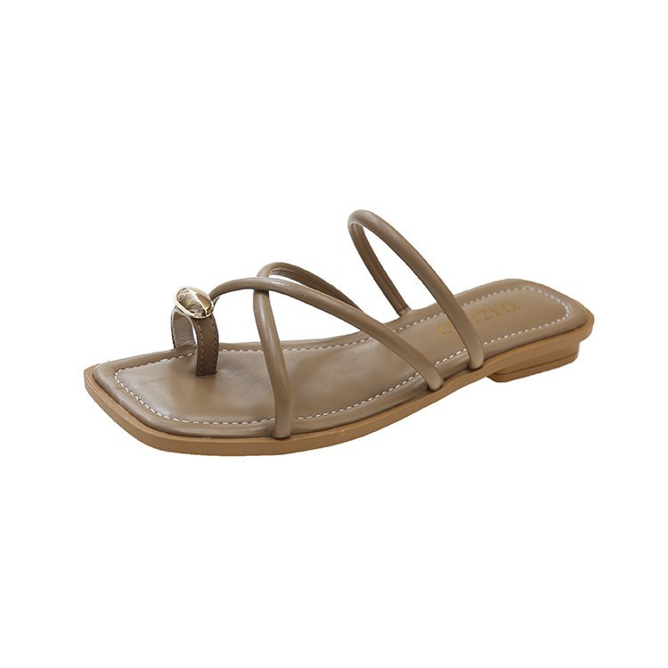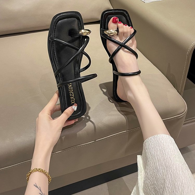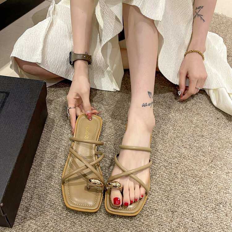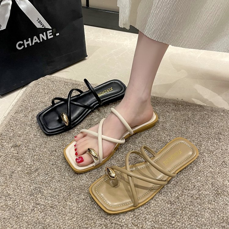 夏季新款平底拖鞋女外穿套脚金属扣交叉一字拖方头凉拖