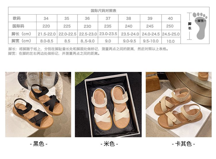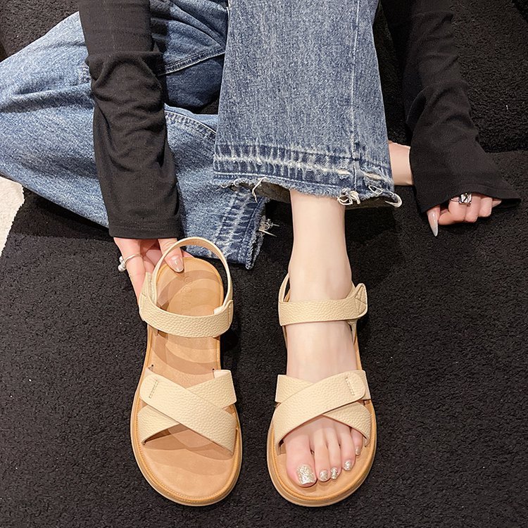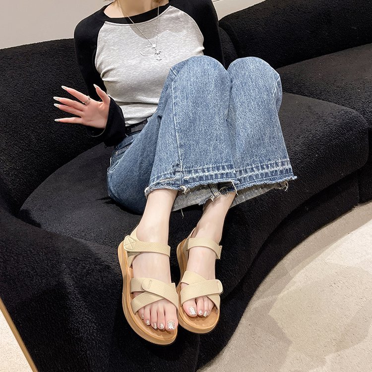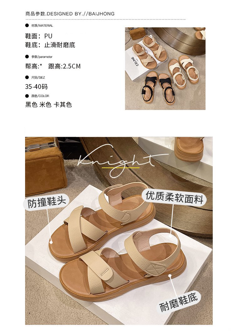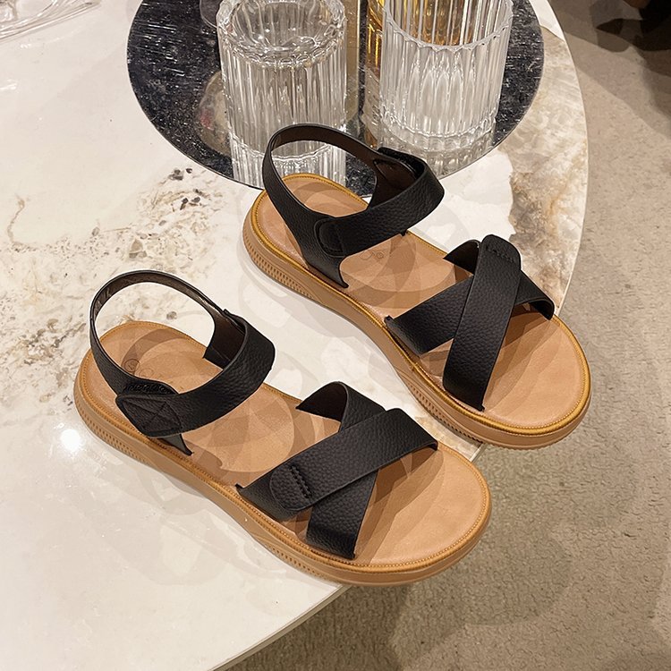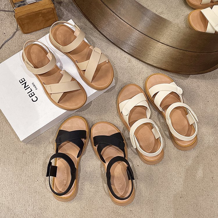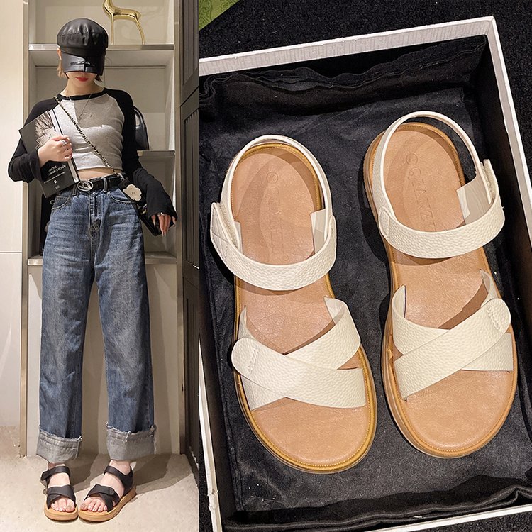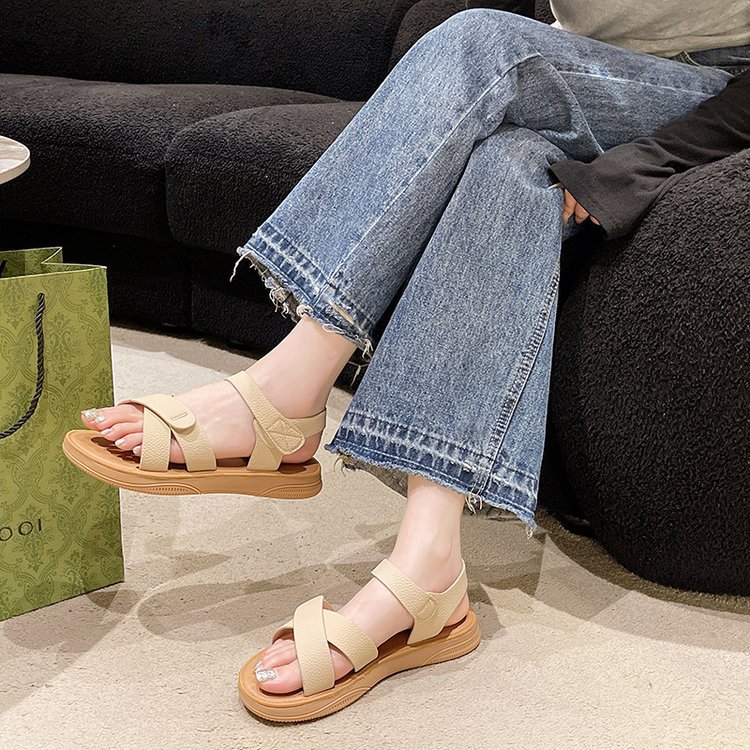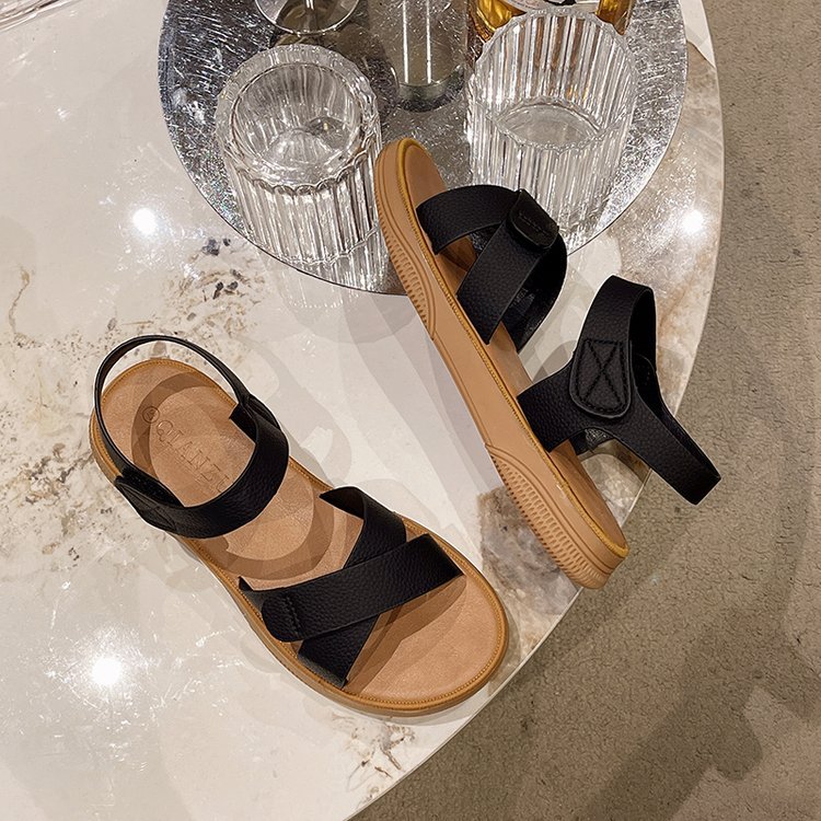 夏季新款平底凉鞋女外穿露趾交叉魔术贴休闲软底学生凉鞋