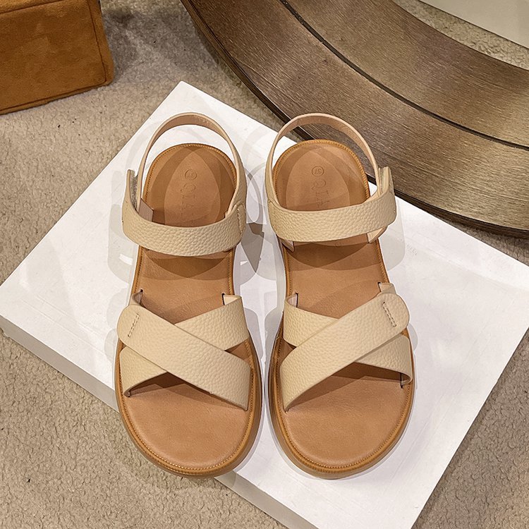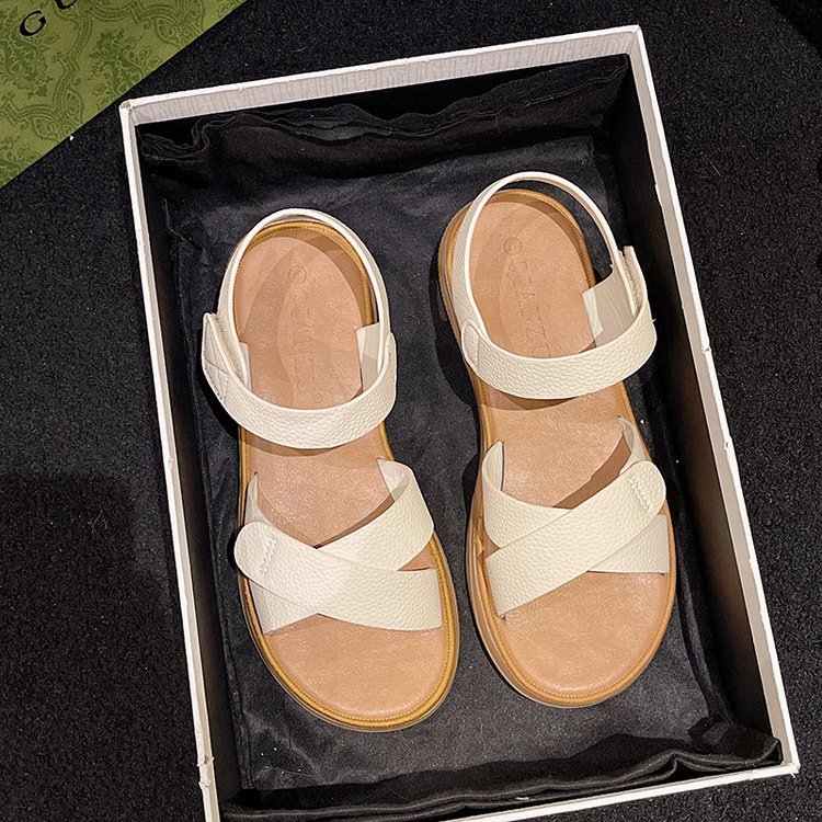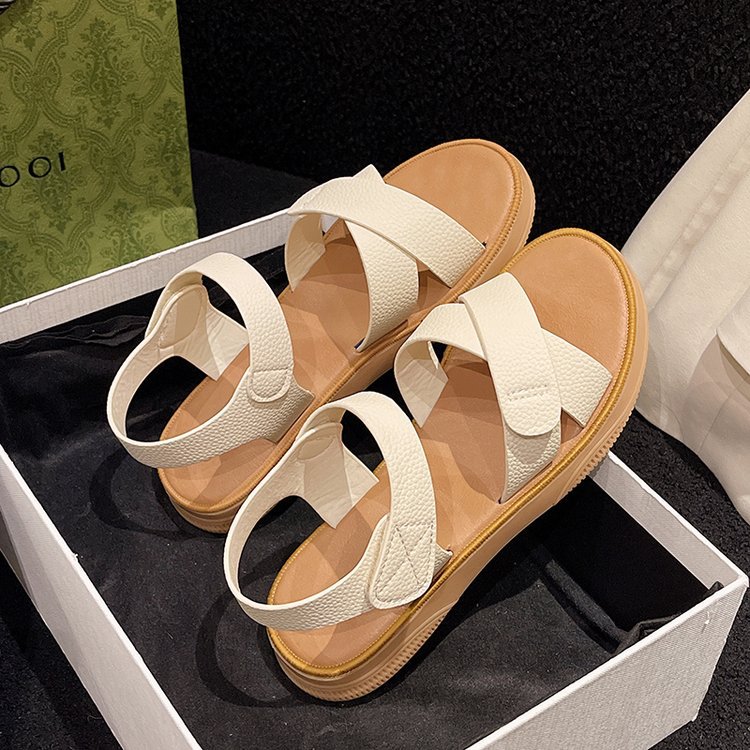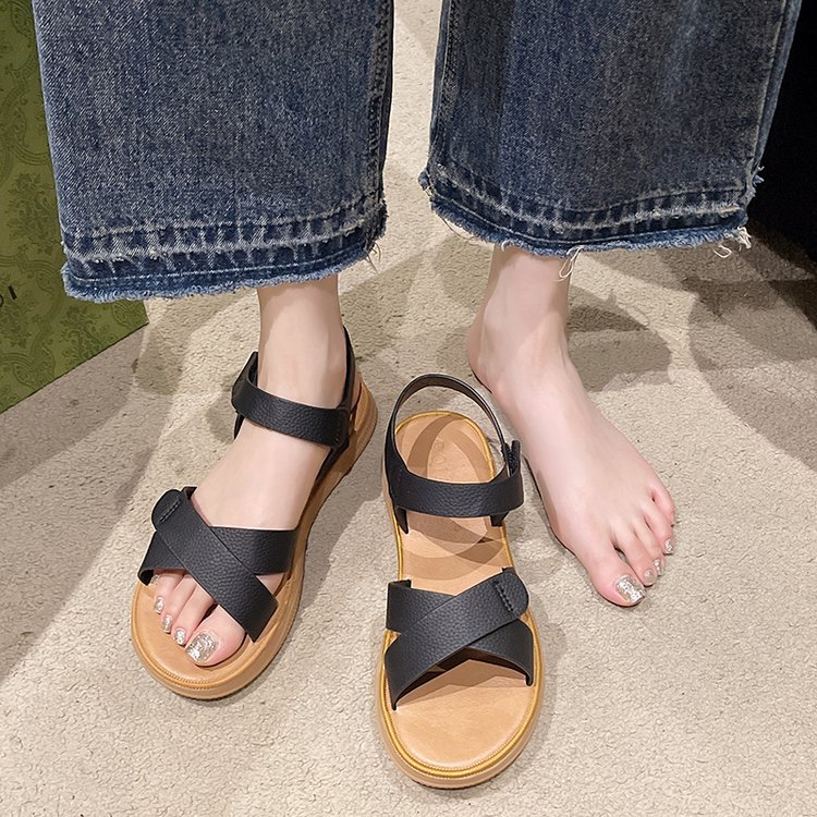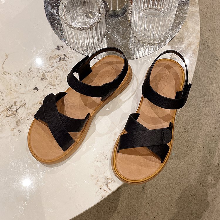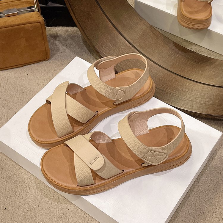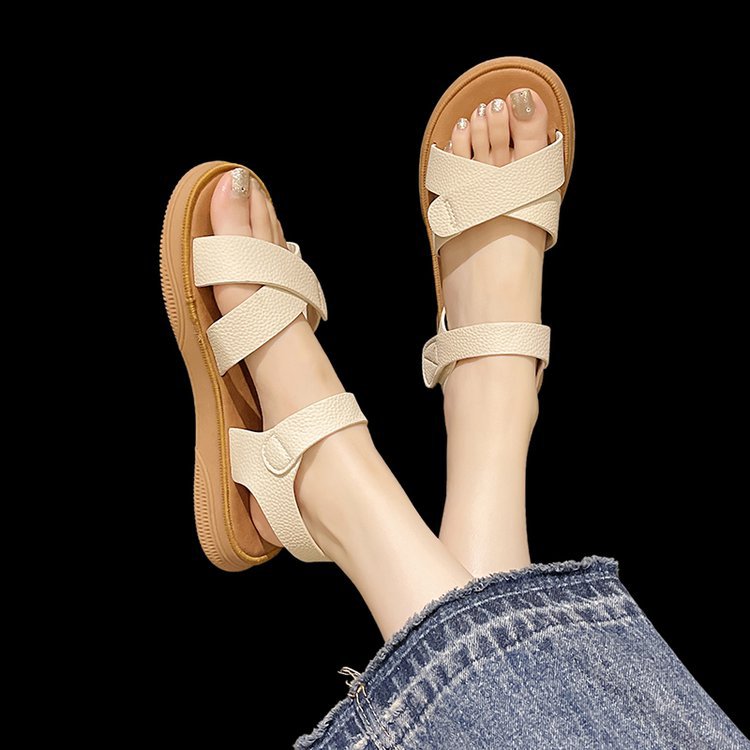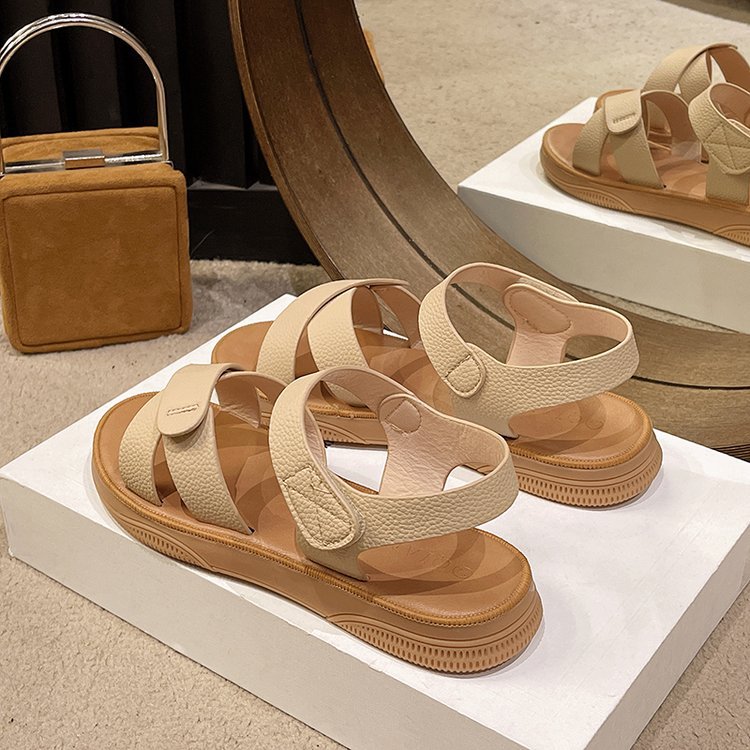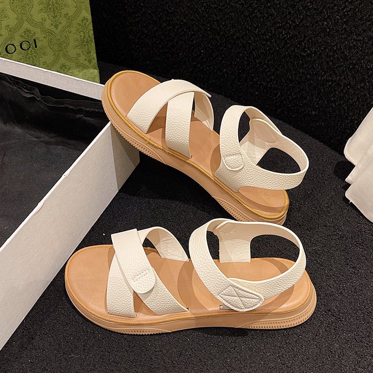 夏季新款平底凉鞋女外穿露趾交叉魔术贴休闲软底学生凉鞋