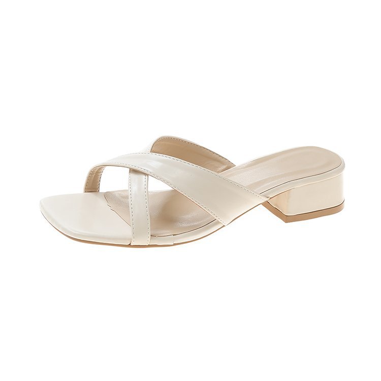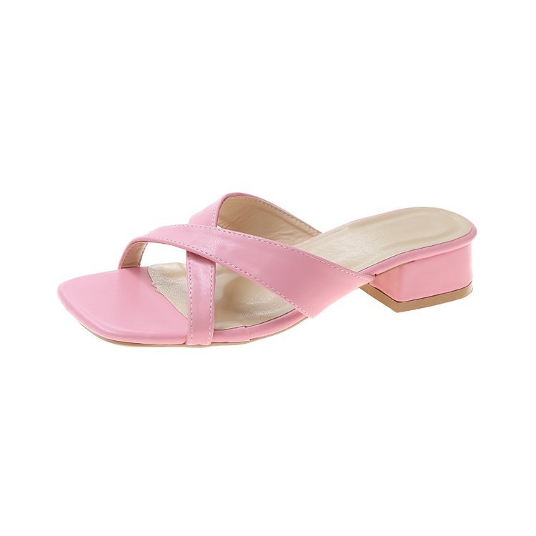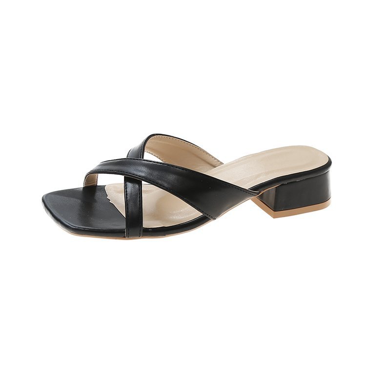 夏季新款外贸粗跟拖鞋女方头露趾交叉一字拖大码中跟凉拖
