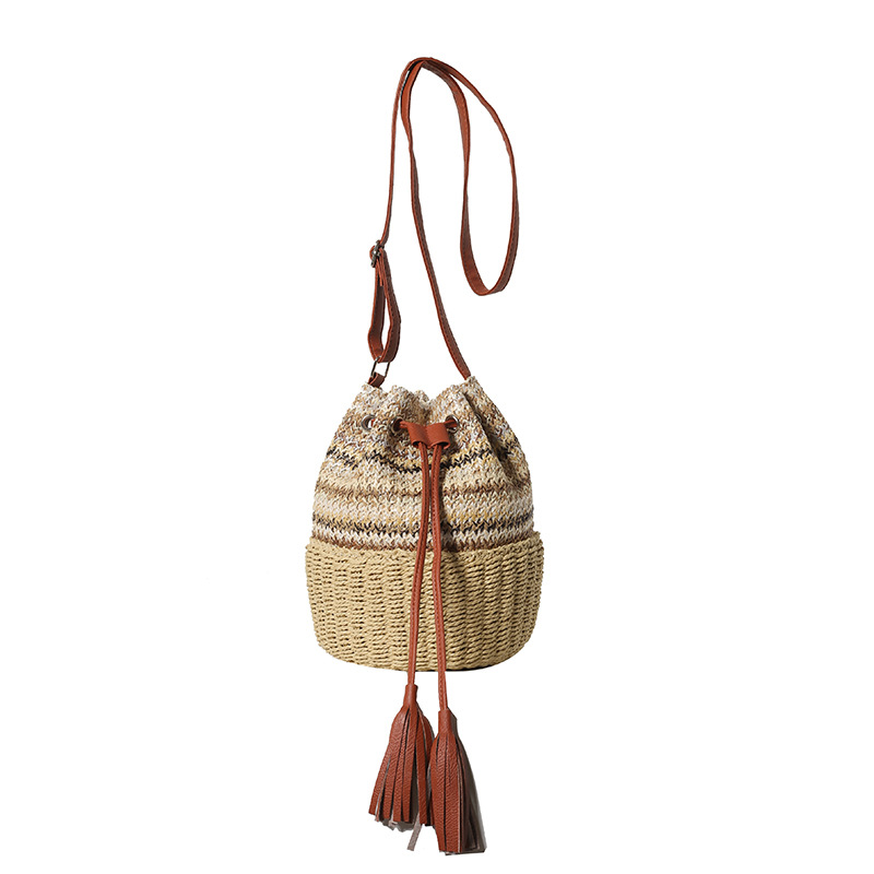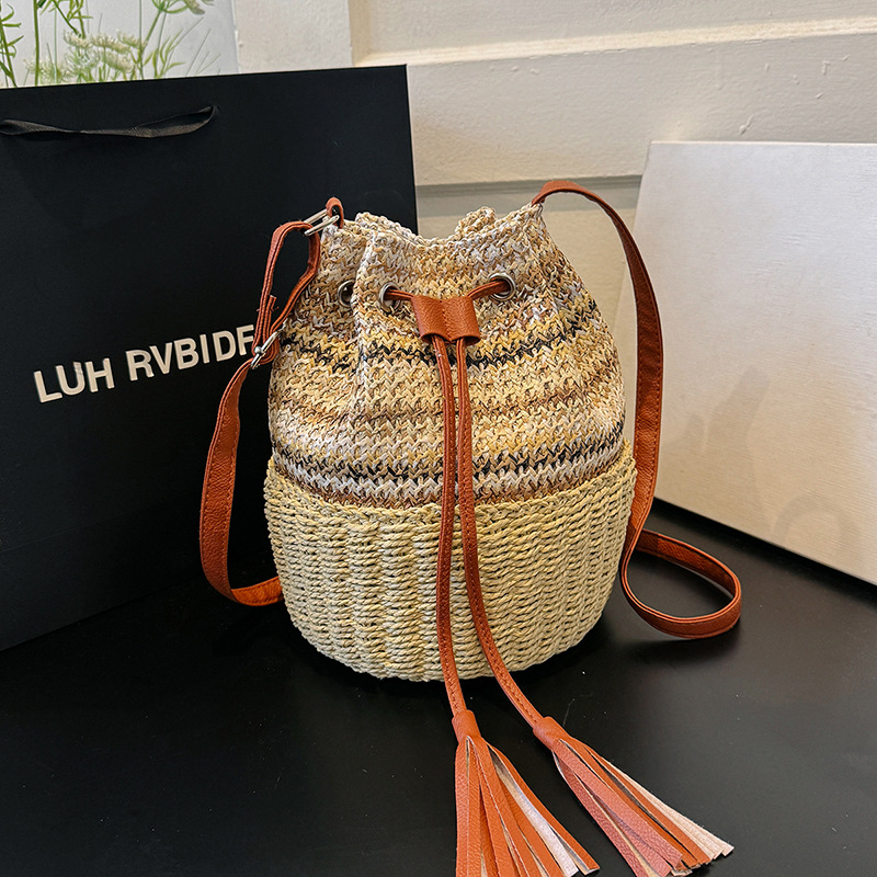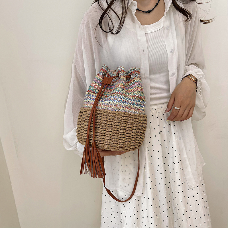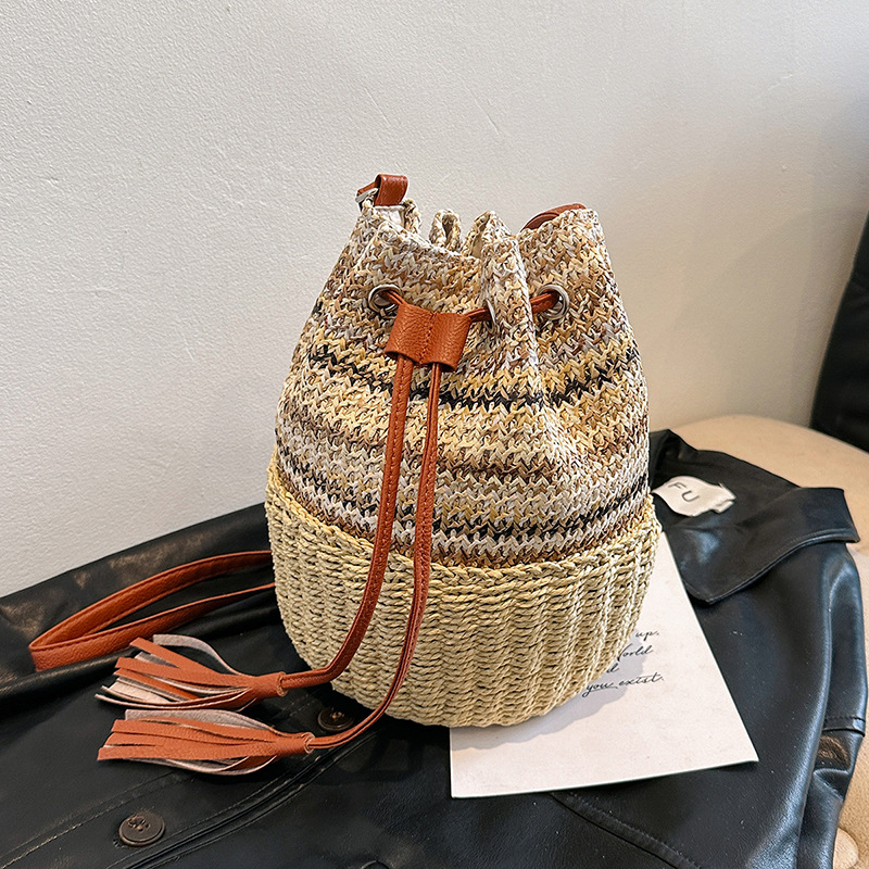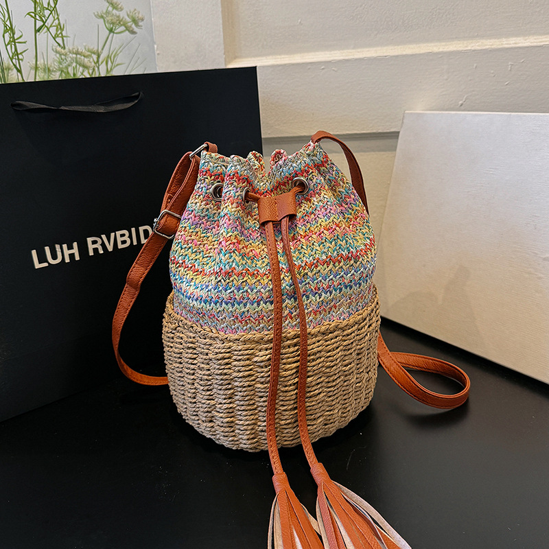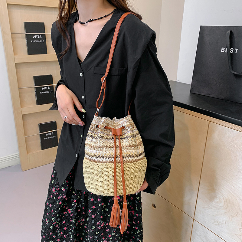 小众设计单肩斜挎水桶编织包波西米亚文艺复古小清新休闲草编包夏