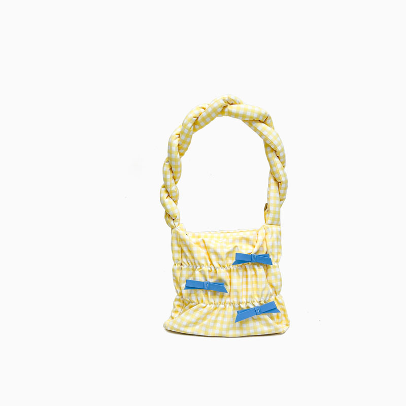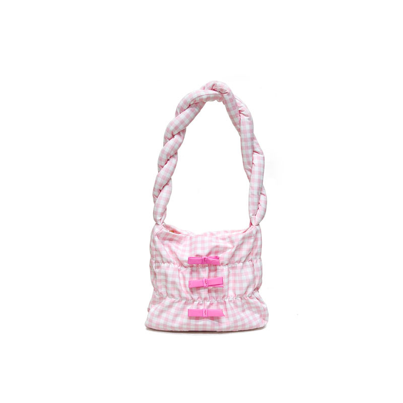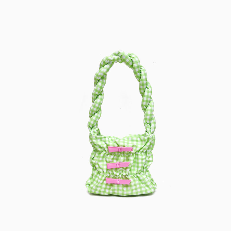 单肩包包女春季新款麻花包可爱蝴蝶结多巴胺奶油格子手提包包