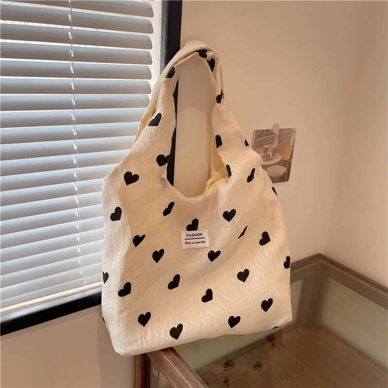 新款纹理爱心小花帆布单肩背心包大容量手提包学生腋下托特包