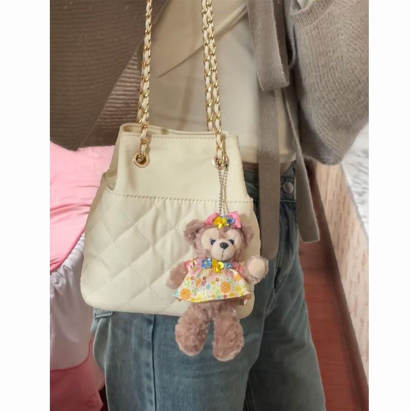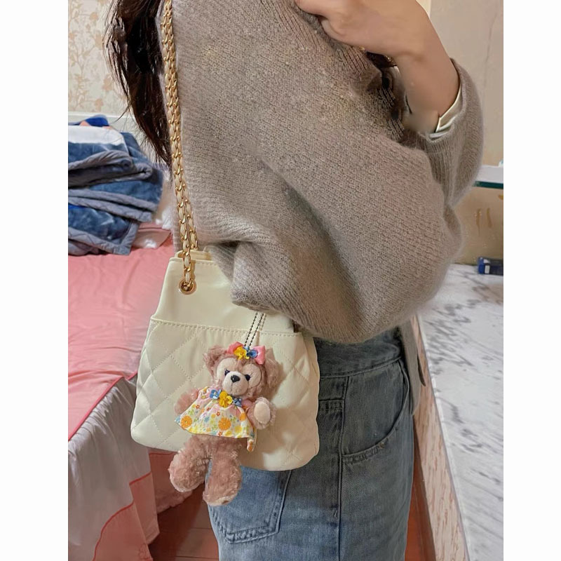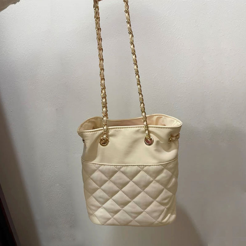 奶油色小香风菱格纹链条包包女夹棉手提单肩包束口水桶包