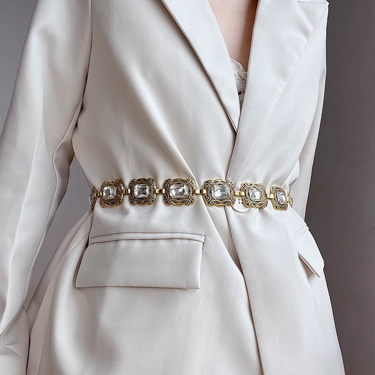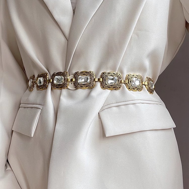 复古腰链配饰连衣裙子民族风金色银色金属椭圆雕花链条水钻腰带女