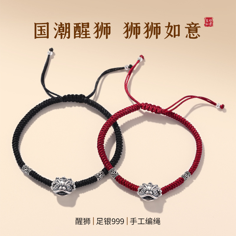 S999银醒狮手工编织红绳手链情侣款手绳女男本命年纯银生日礼物