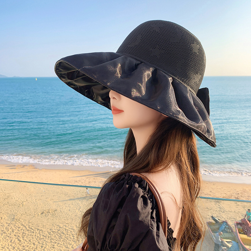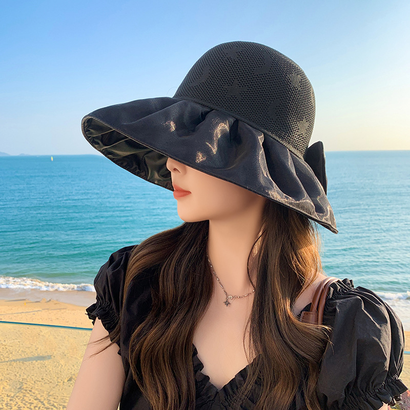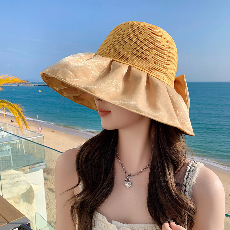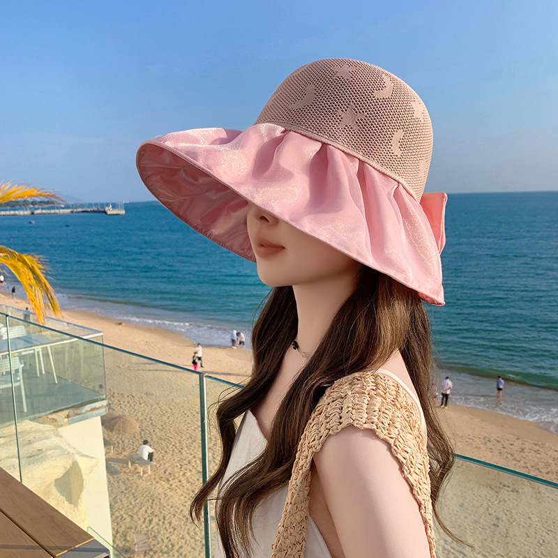 新款春夏蝴蝶结渔夫帽网纱可折叠时尚遮阳太阳帽女个性沙滩帽子潮