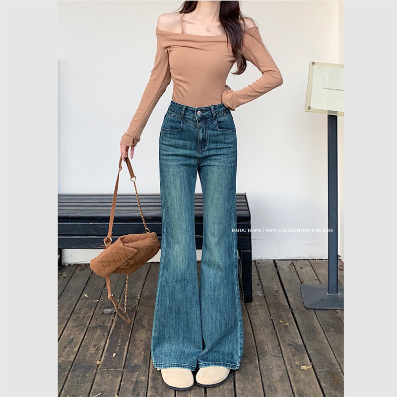 新款复古水洗蓝牛仔裤女高腰显瘦直筒喇叭裤女
