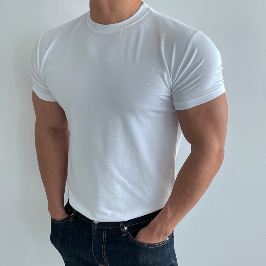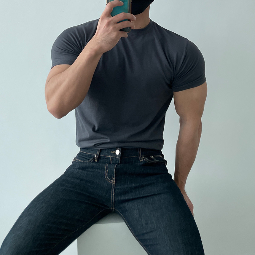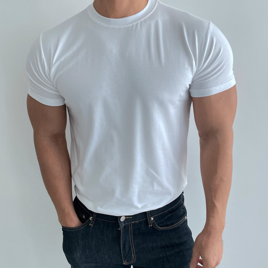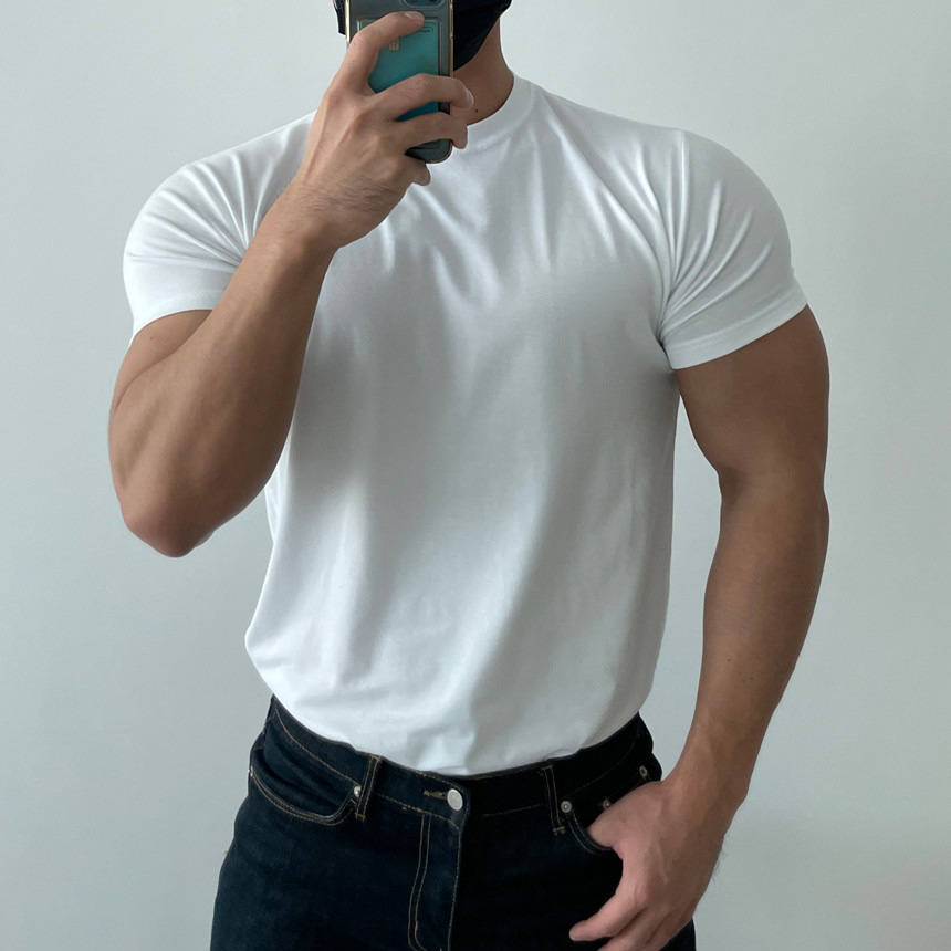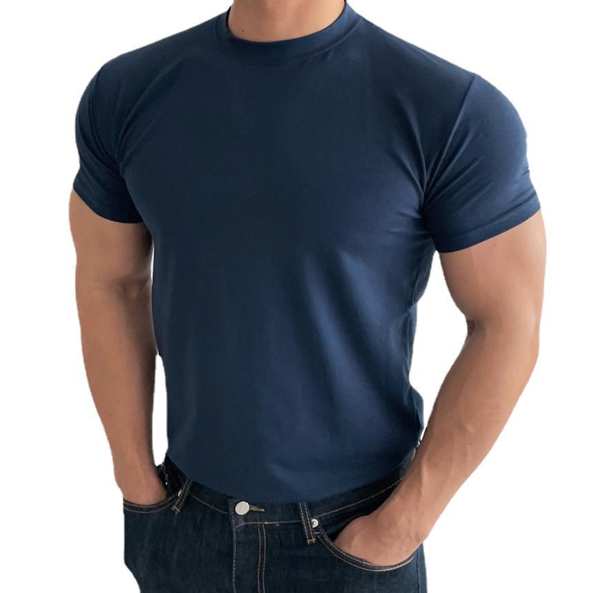 夏季男士健身运动束口棉质弹力吸汗透气纯色打底显大修身短袖T恤
