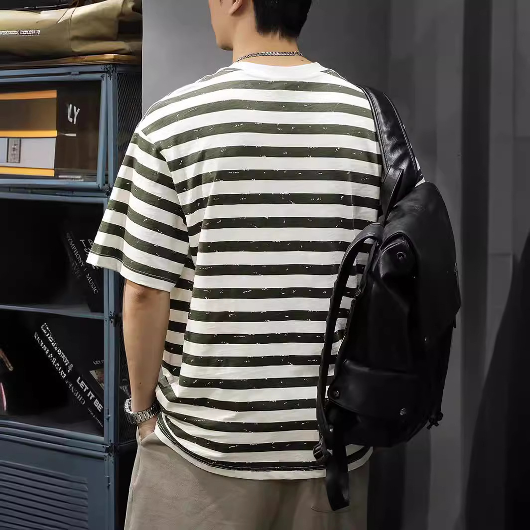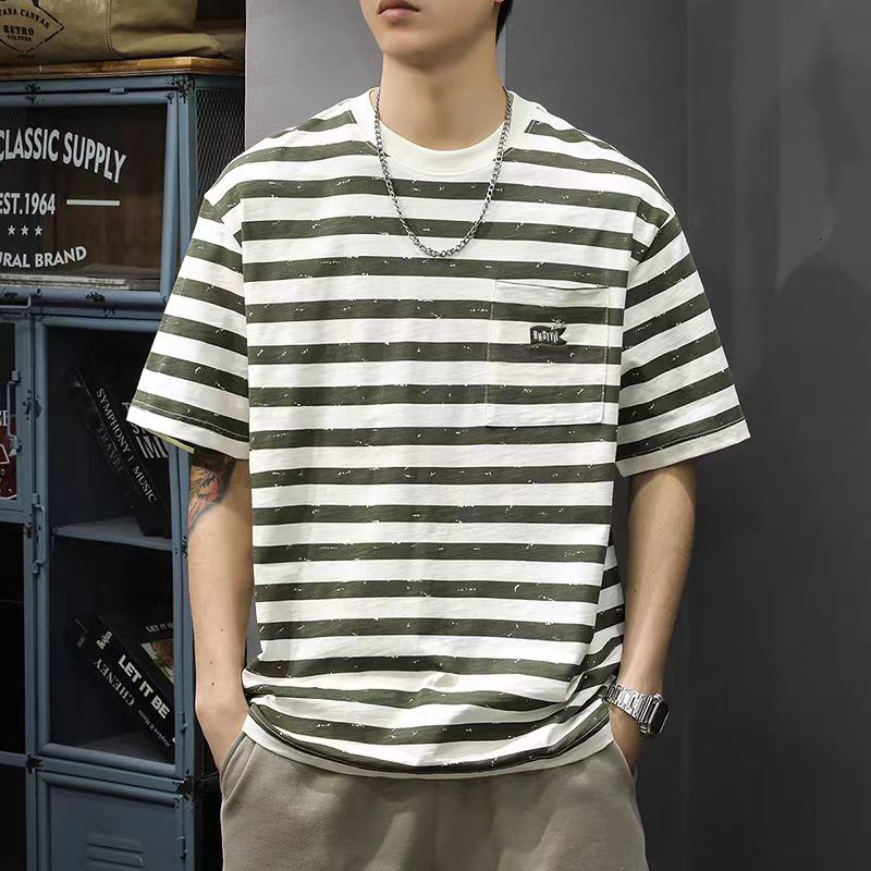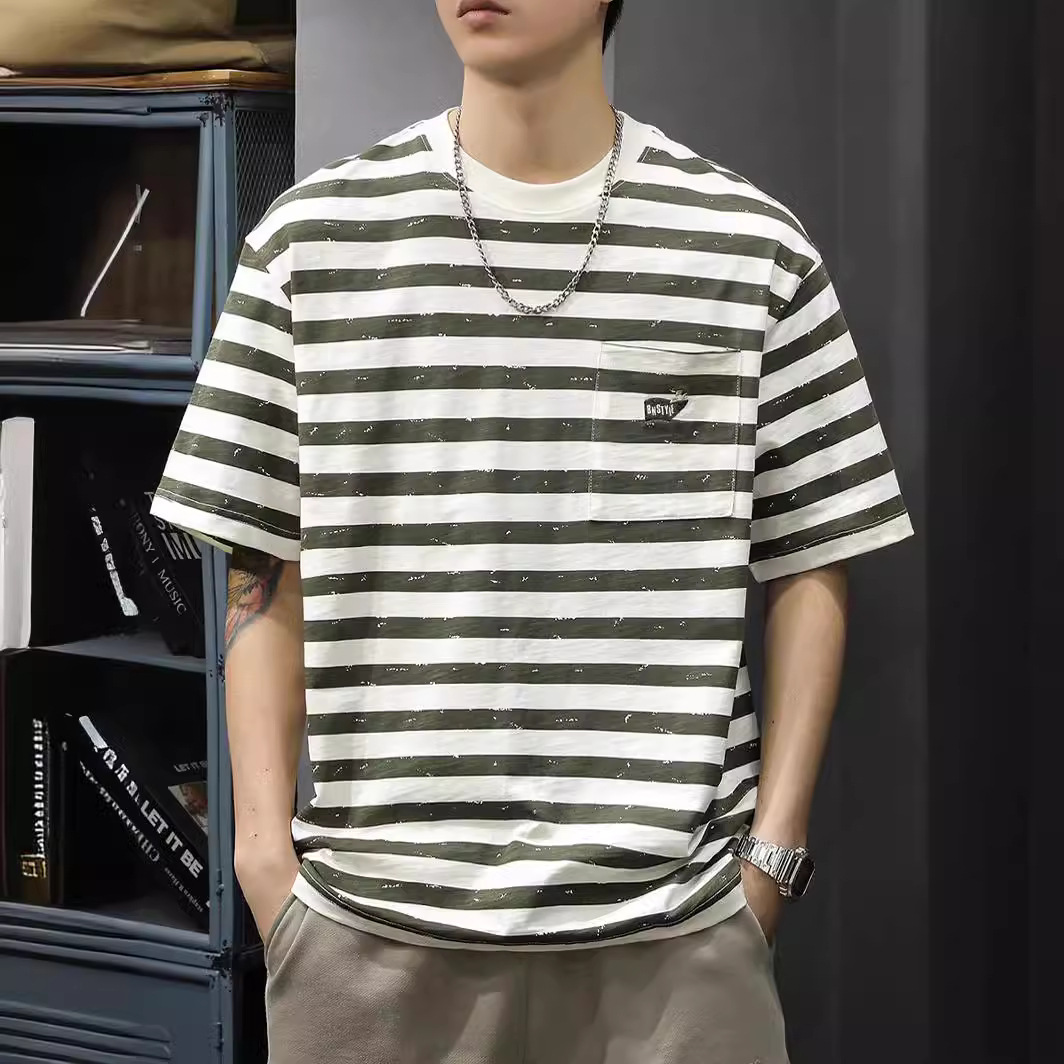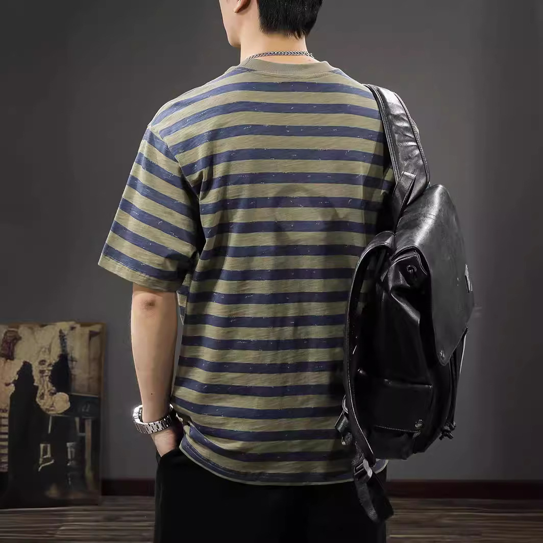 新款条纹休闲短袖T恤男复古宽松大码半袖夏季纯棉海魂衫体恤