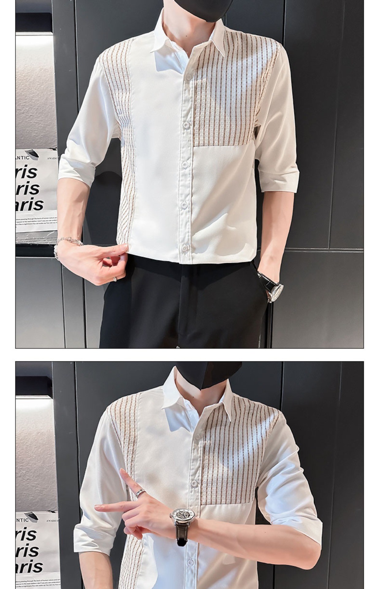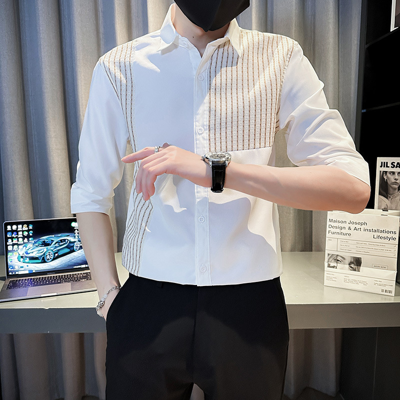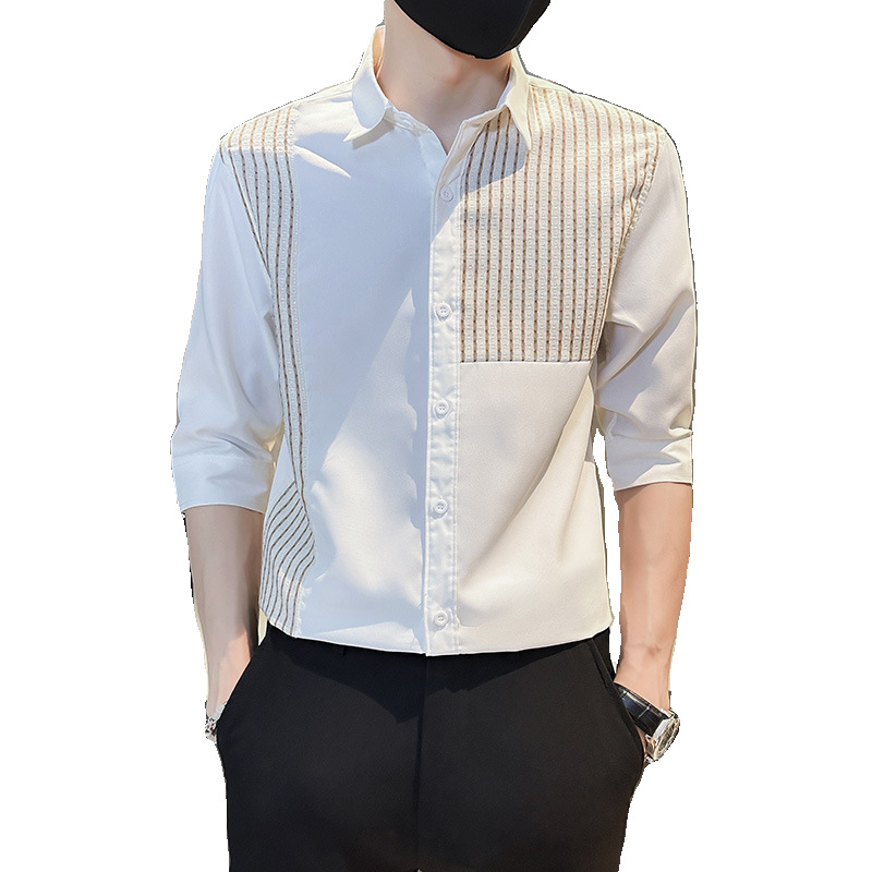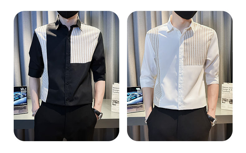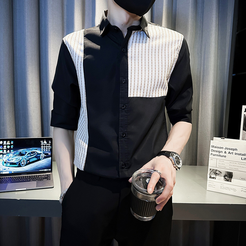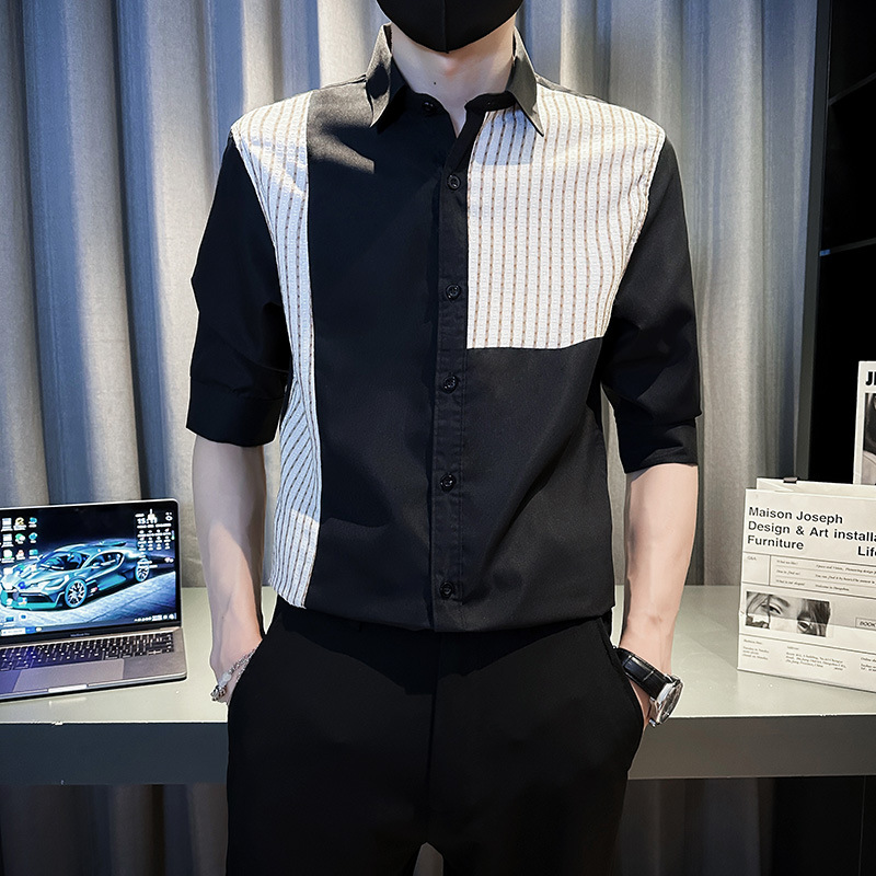 薄款冰丝条纹拼接中袖衬衫男士夏季潮流修身痞帅翻领五分袖衬衣服