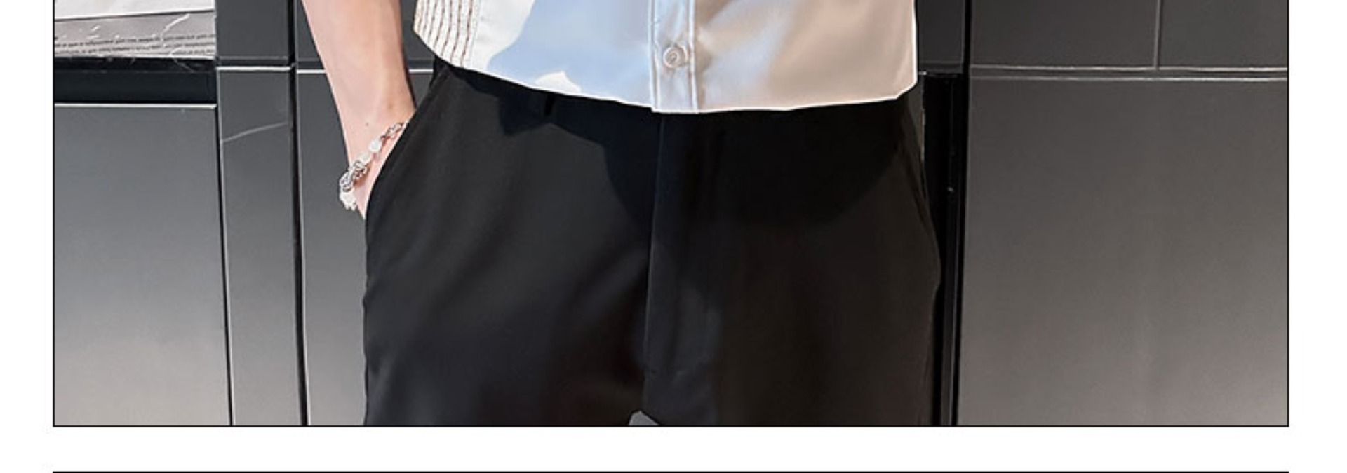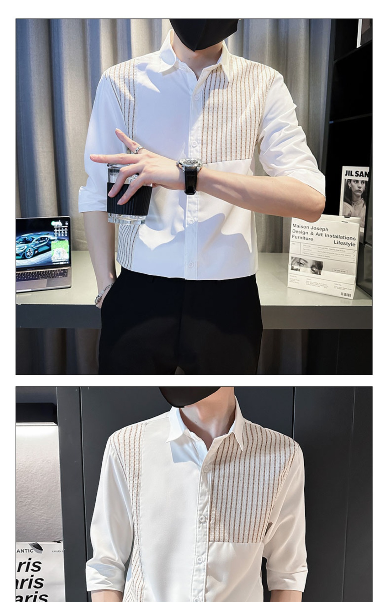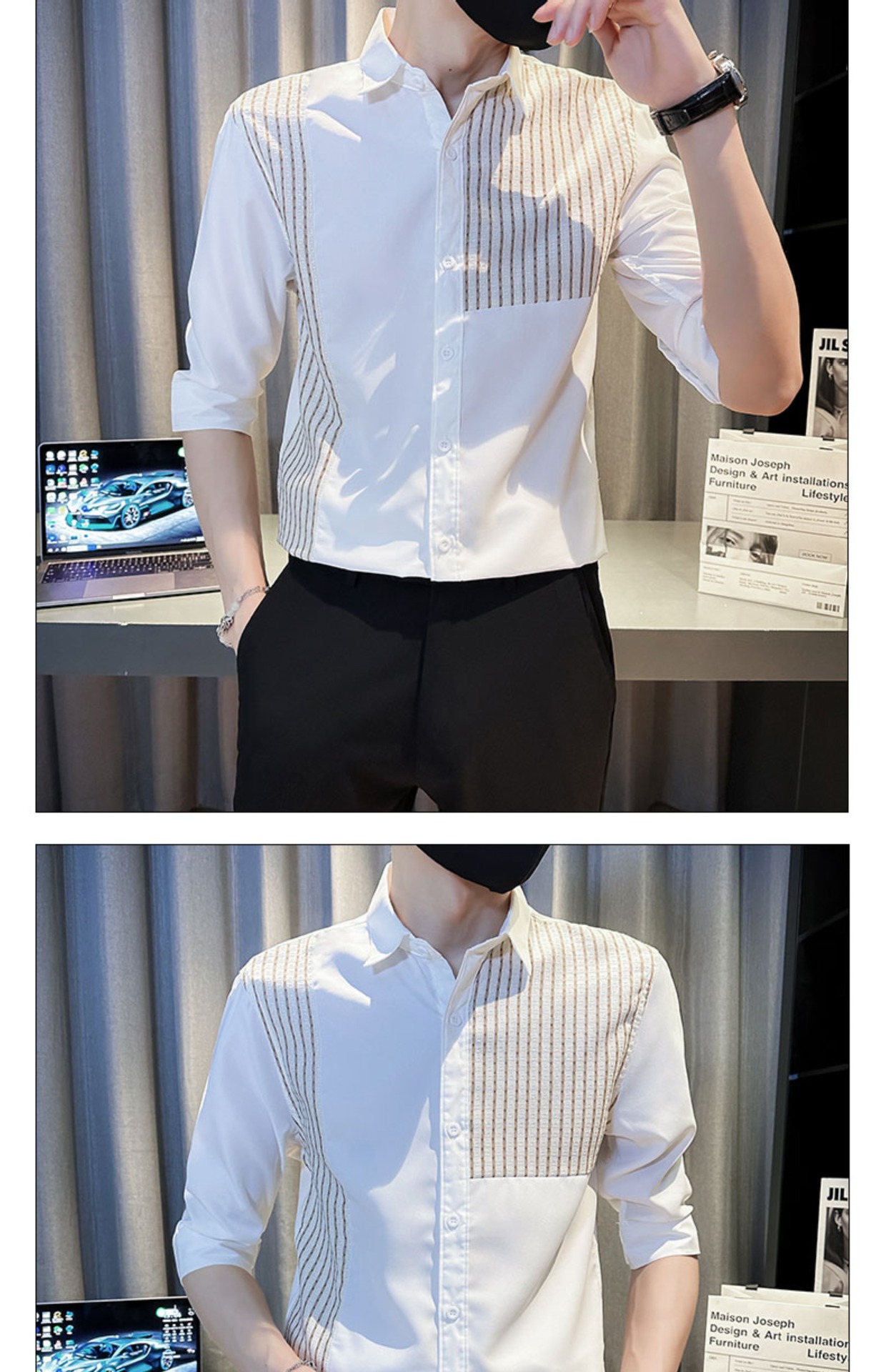 薄款冰丝条纹拼接中袖衬衫男士夏季潮流修身痞帅翻领五分袖衬衣服