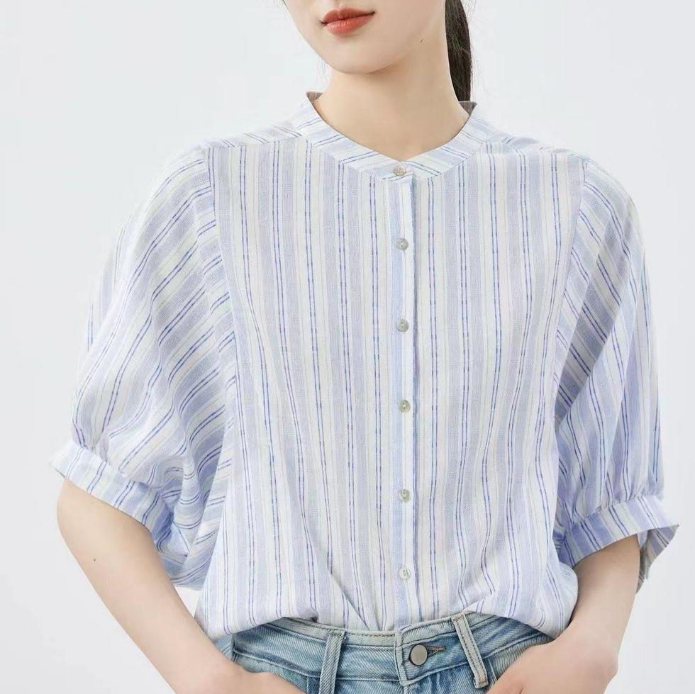 温文尔雅法式条纹清新色织薄棉蝙蝠袖衬衫女