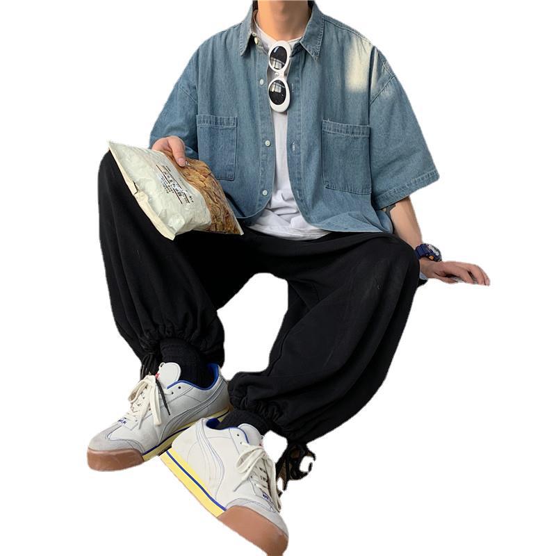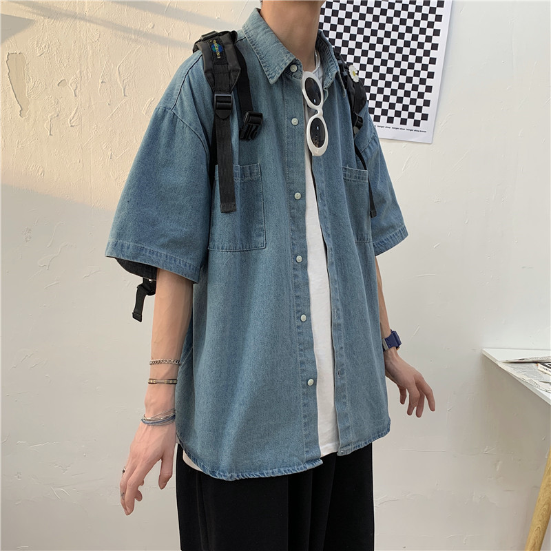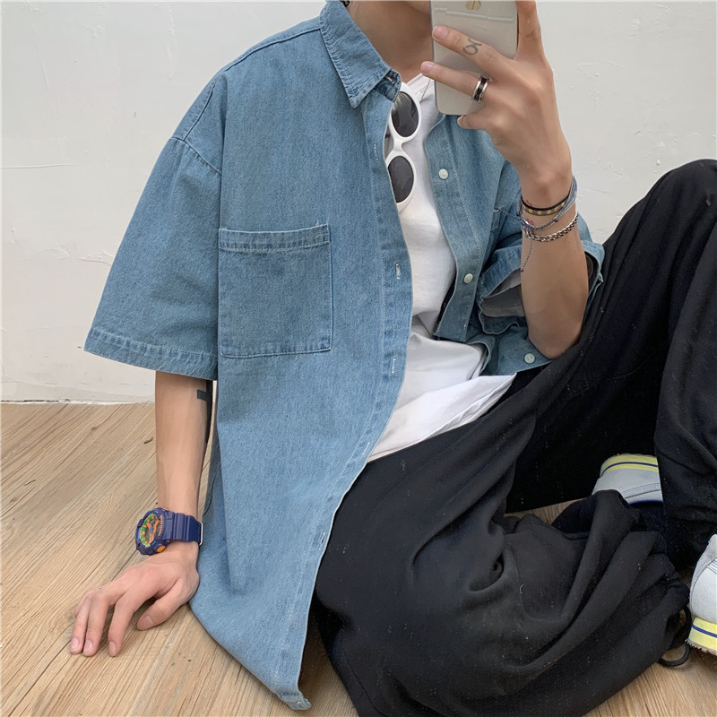 蓝色牛仔短袖衬衫男士夏季新款港风痞帅防晒衬衣男生休闲外套