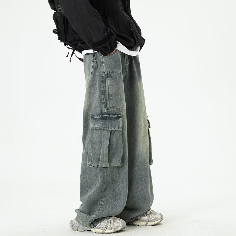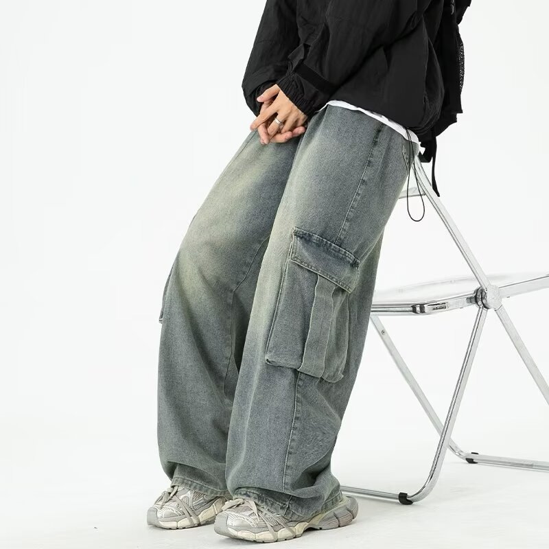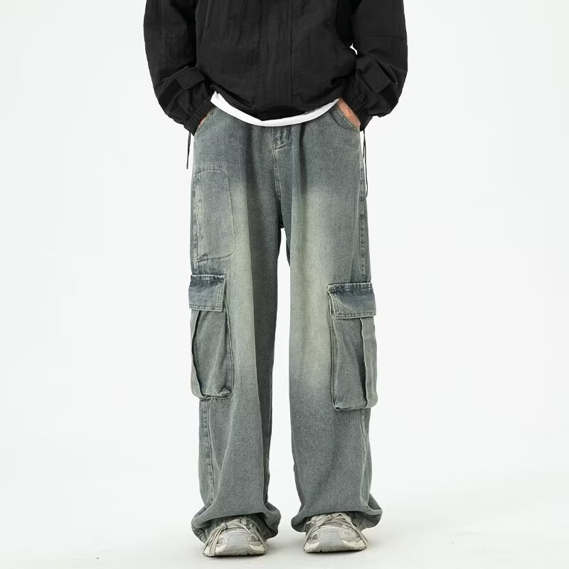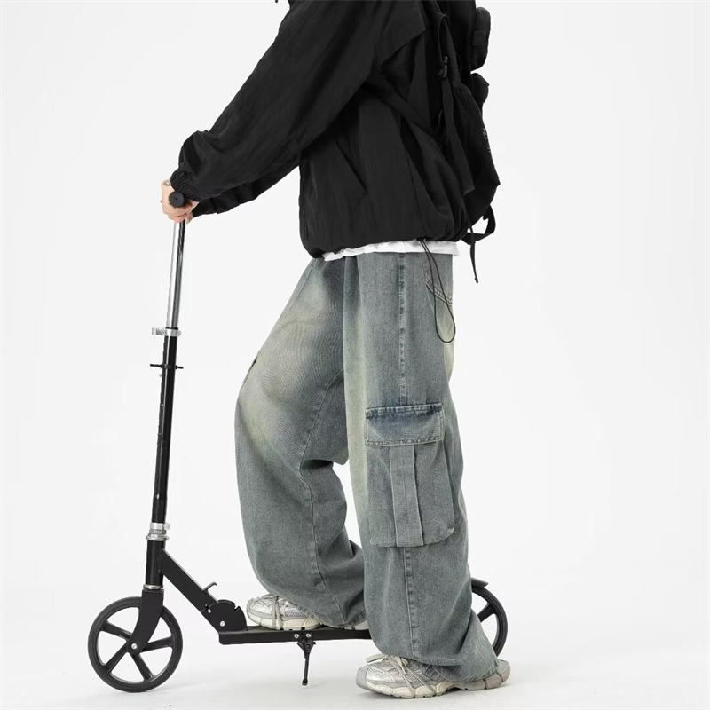 阔腿工装牛仔裤男款夏季潮牌大口袋宽松裤子水洗复古高街拖地长裤