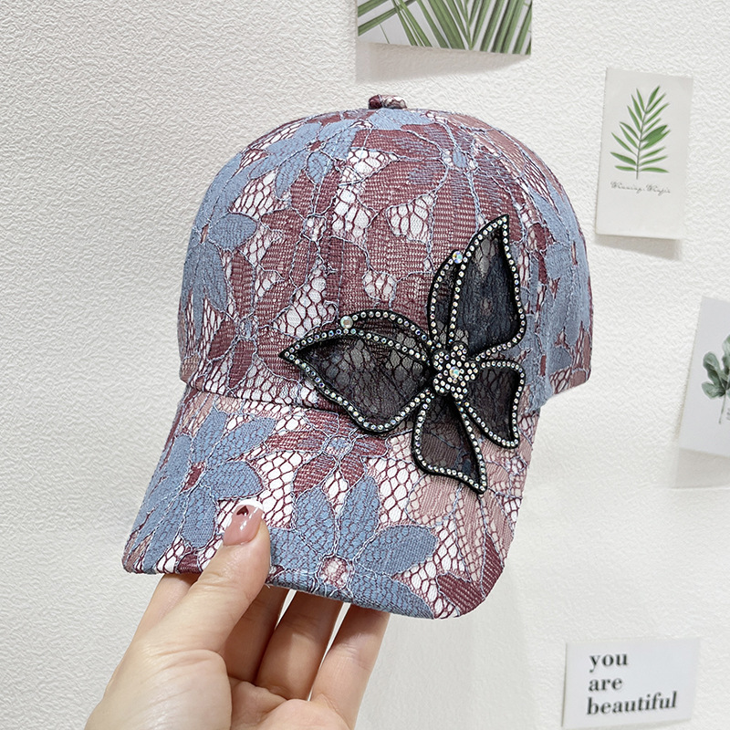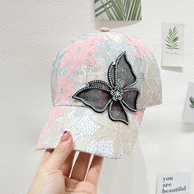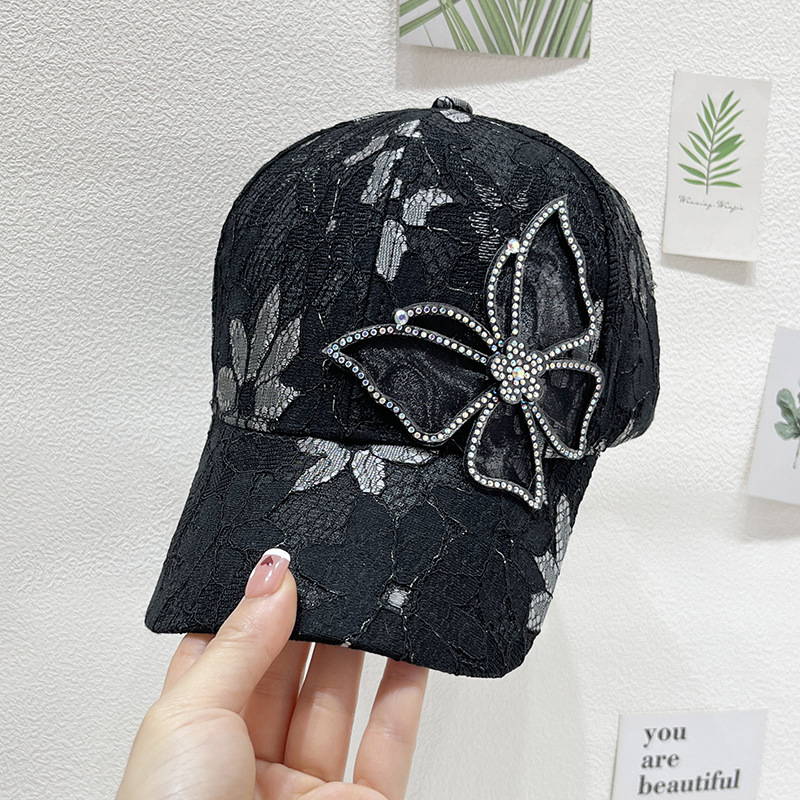 新款蕾丝遮阳帽子女夏天网纱镶钻蝴蝶棒球帽时尚防晒太阳鸭舌帽潮