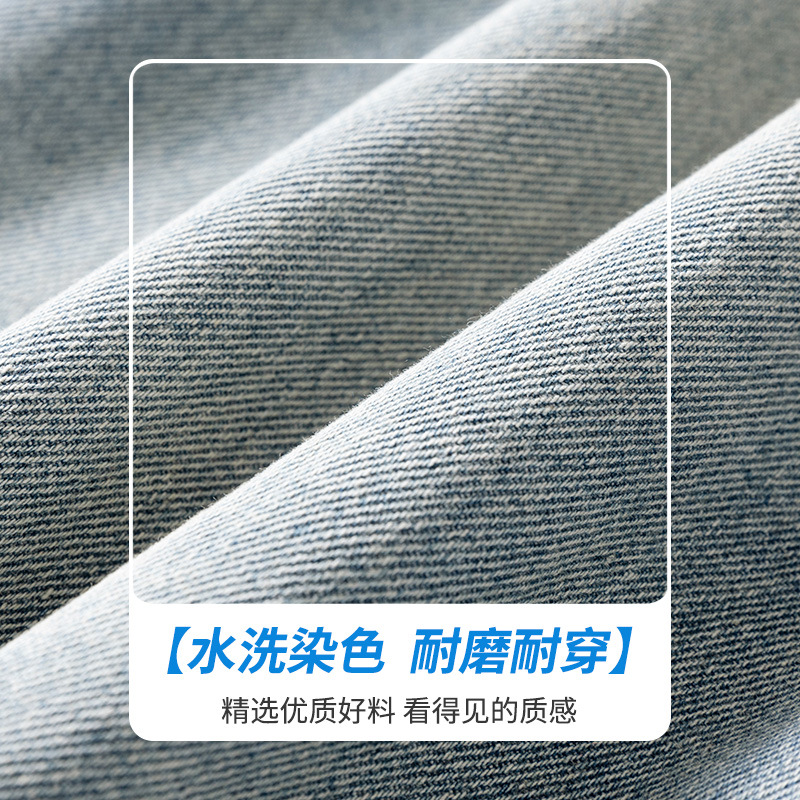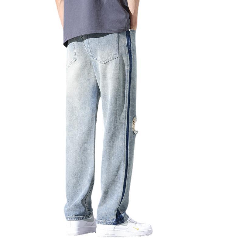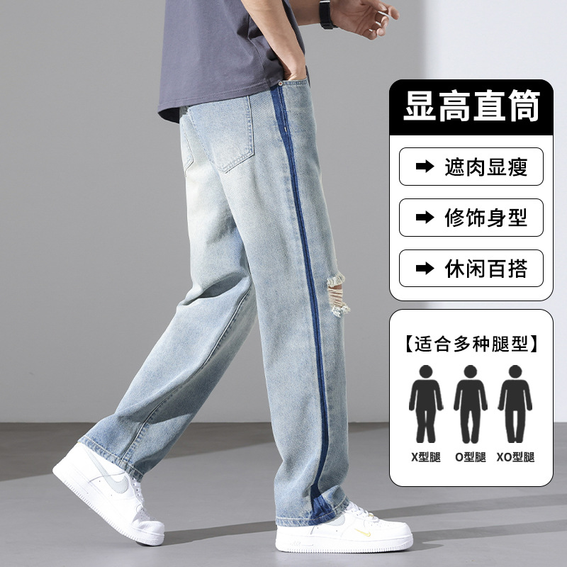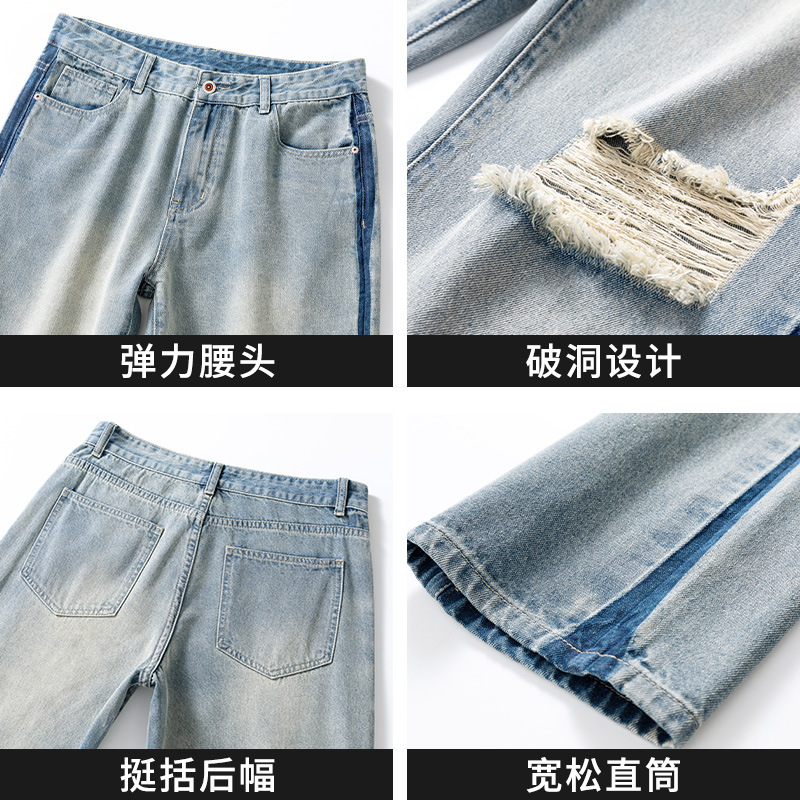 潮流百搭男款牛仔裤子夏季新款美式高街直筒浅蓝男士破洞长裤