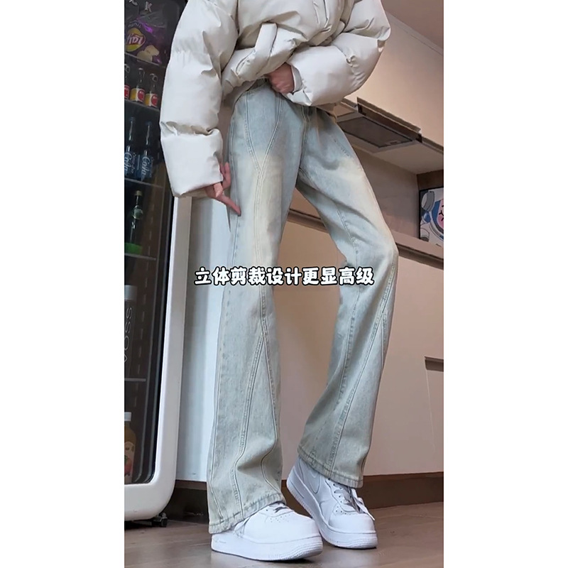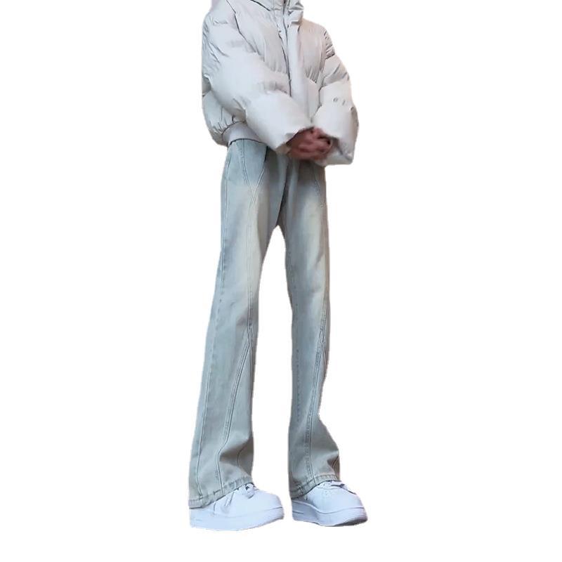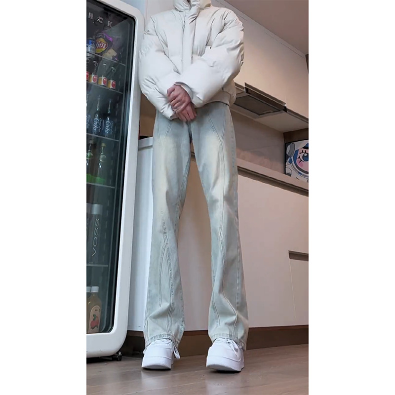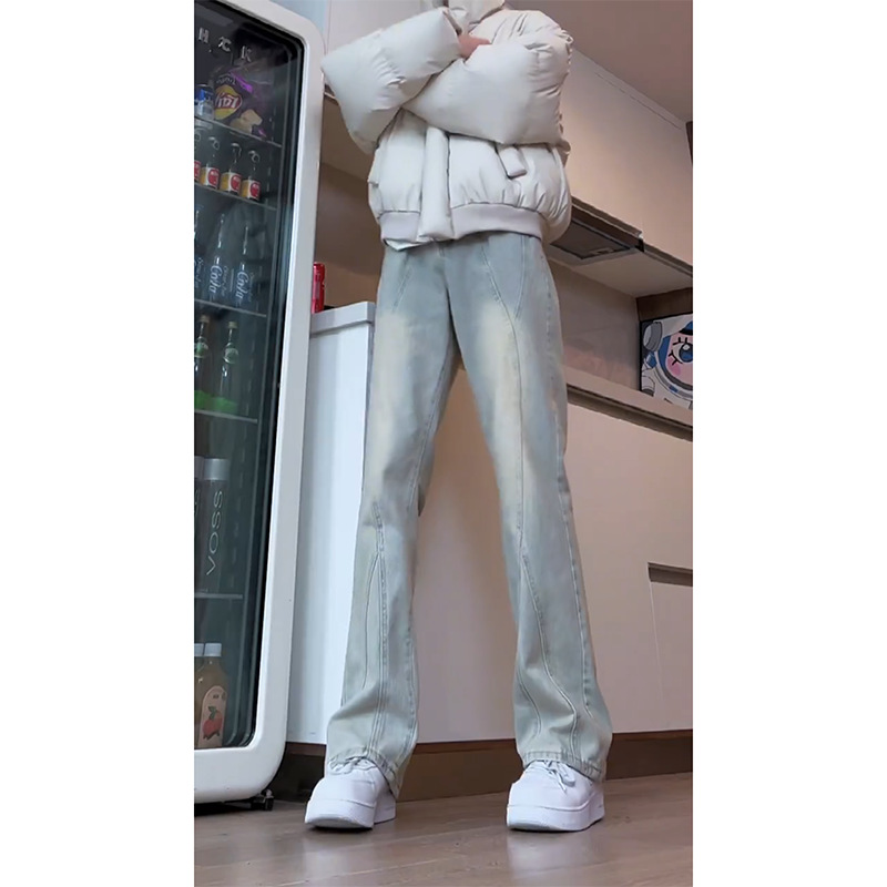 黄泥色牛仔裤男款夏季拼接设计感裤子美式高街vibe窄版直筒微喇裤