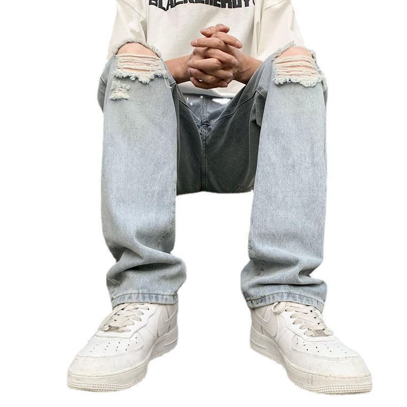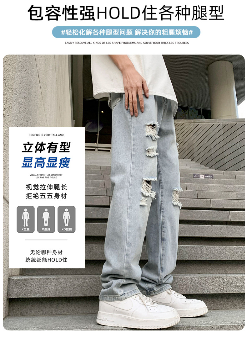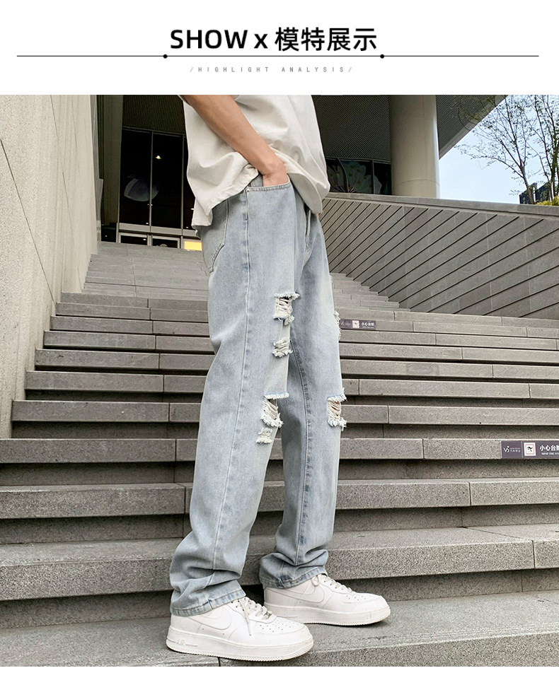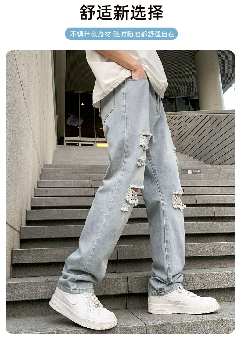浅色破洞牛仔裤男潮流时尚高街帅气垂感休闲长裤夏季薄款直筒裤子