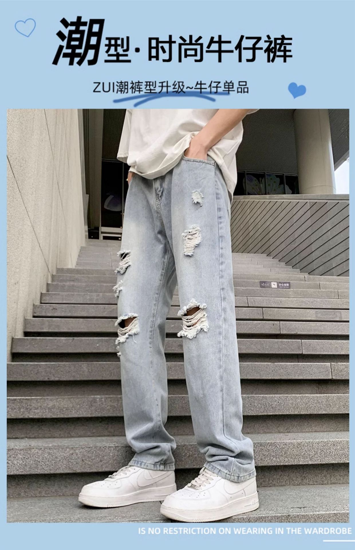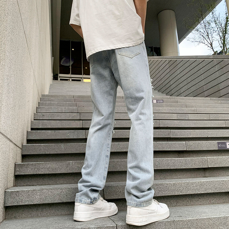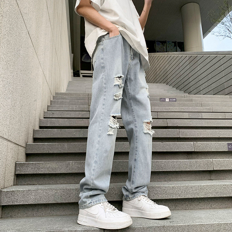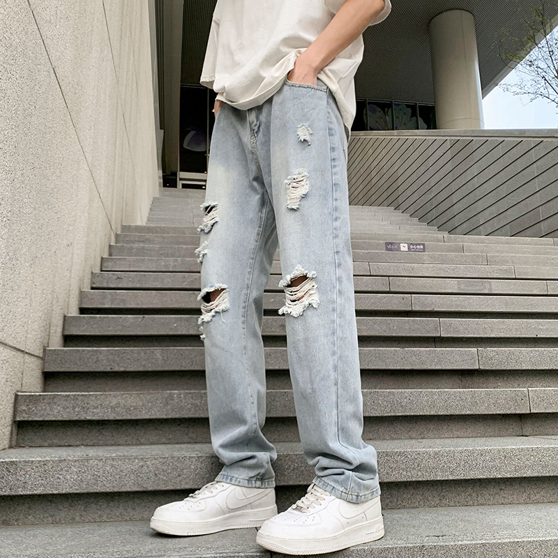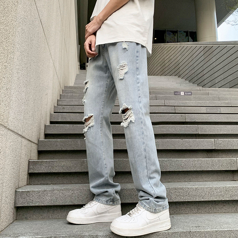 浅色破洞牛仔裤男潮流时尚高街帅气垂感休闲长裤夏季薄款直筒裤子