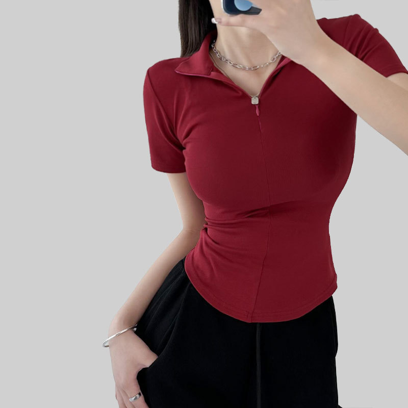 纯欲拉链翻领t恤短袖上衣女夏季辣妹短款收腰拽酷美式修身打底衫